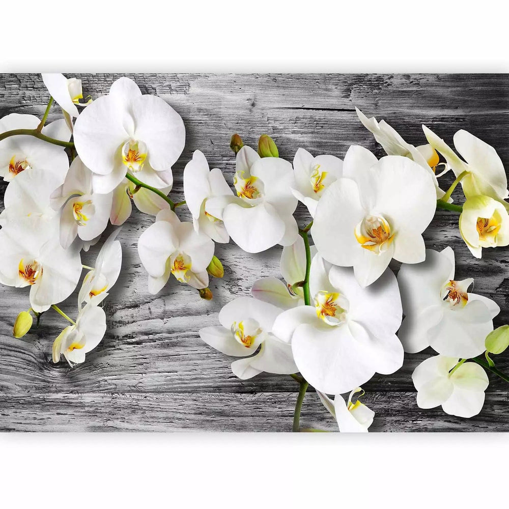 Fototapetes ar baltām orhidejām uz pelēka koka faktūras, 60309 G-ART
