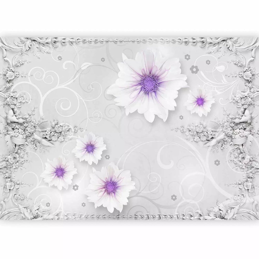 Fototapetes ar ziediem baltā krāsā un elementiem violetā krāsā G-ART