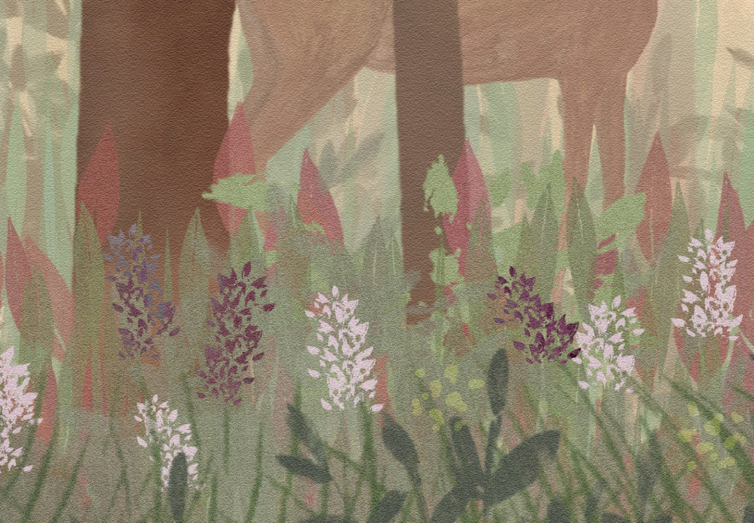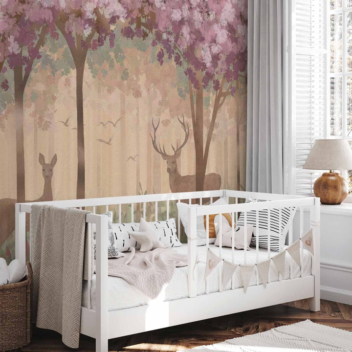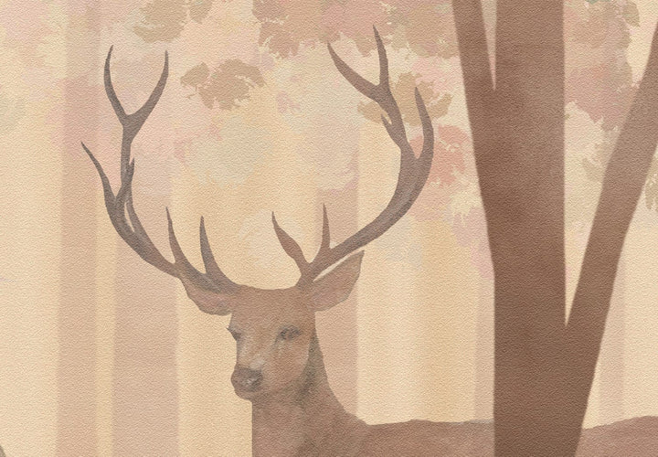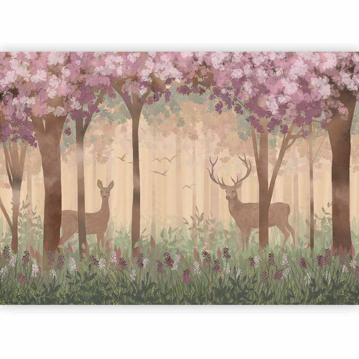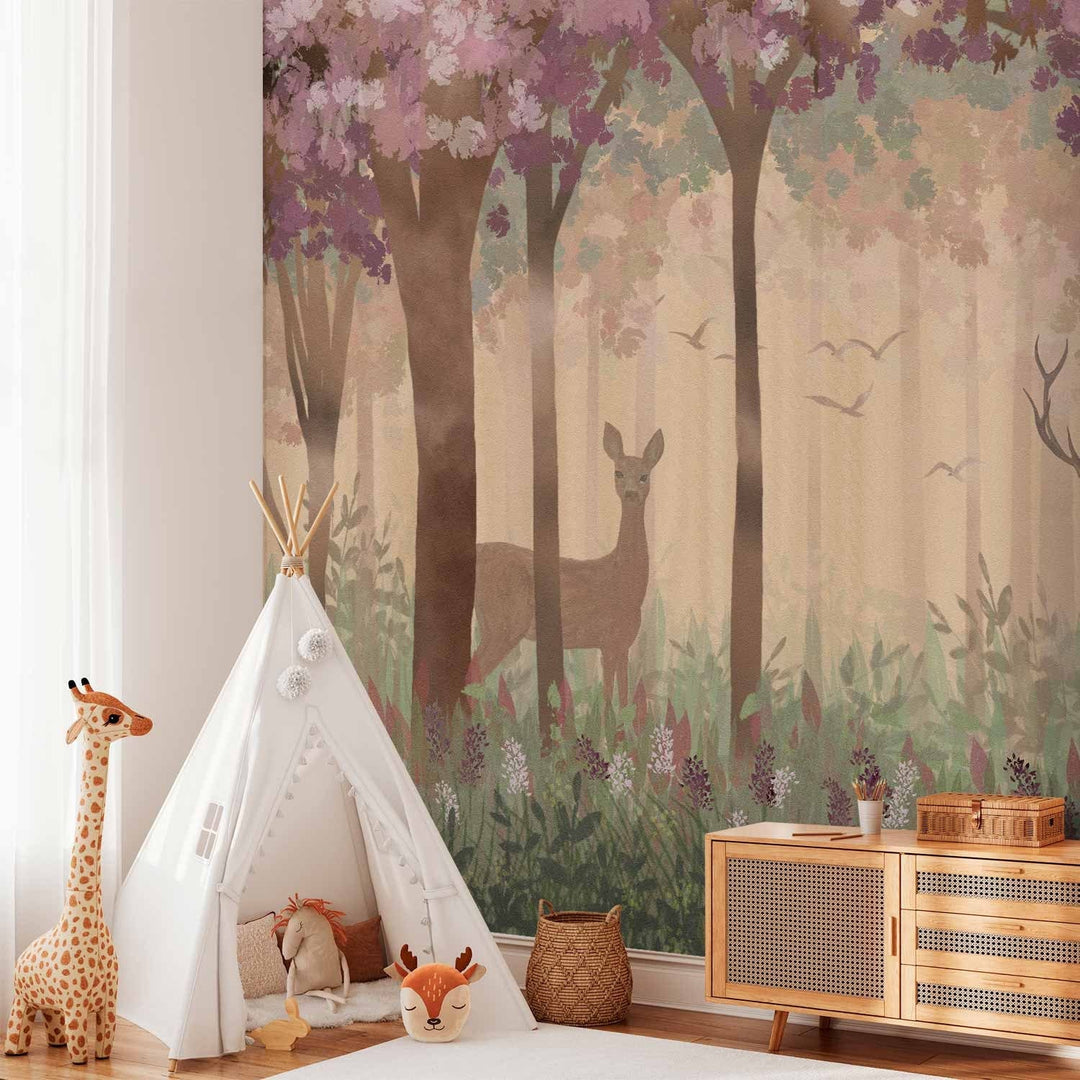 Valokuvatapetti taimitarhalle, jossa on piirretty metsä ja peura - Aamu metsässä, 143434
