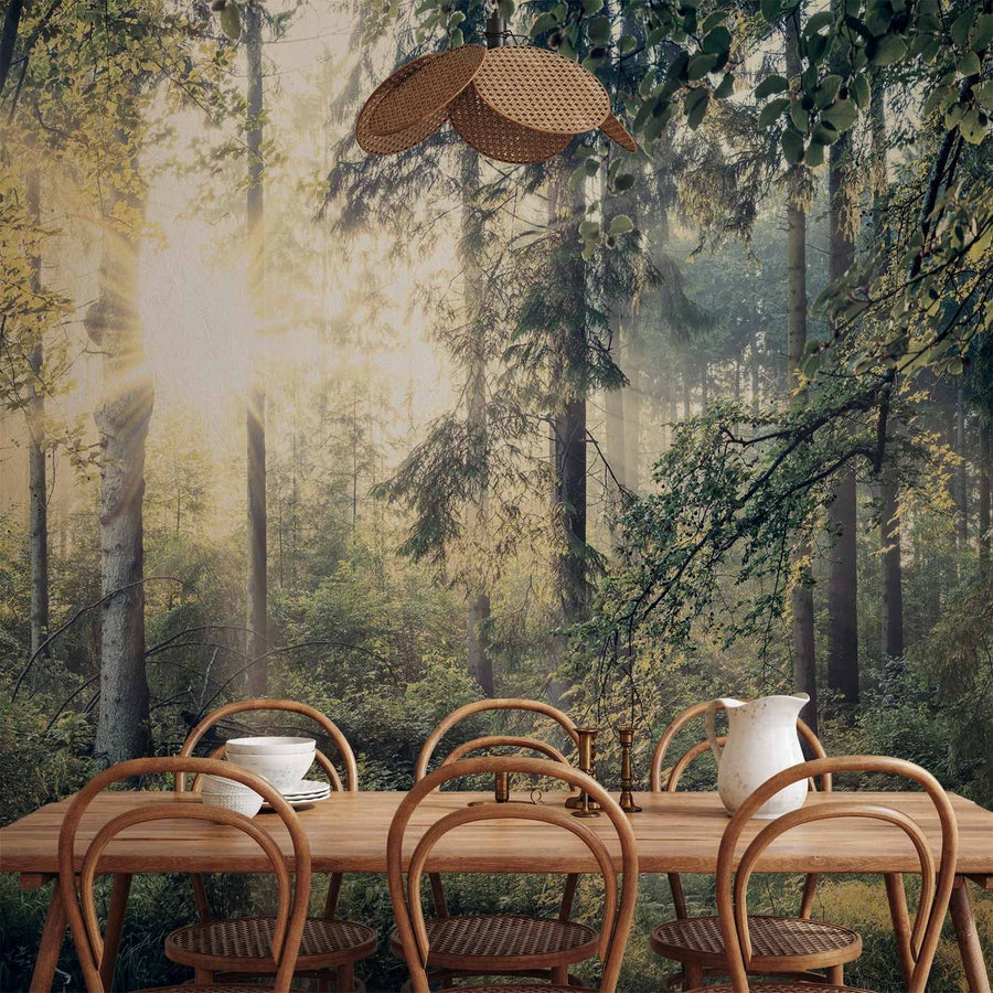 Fototapetes ar mežu - Miglains mežs - zaļos toņos - dabas noskaņa G-ART