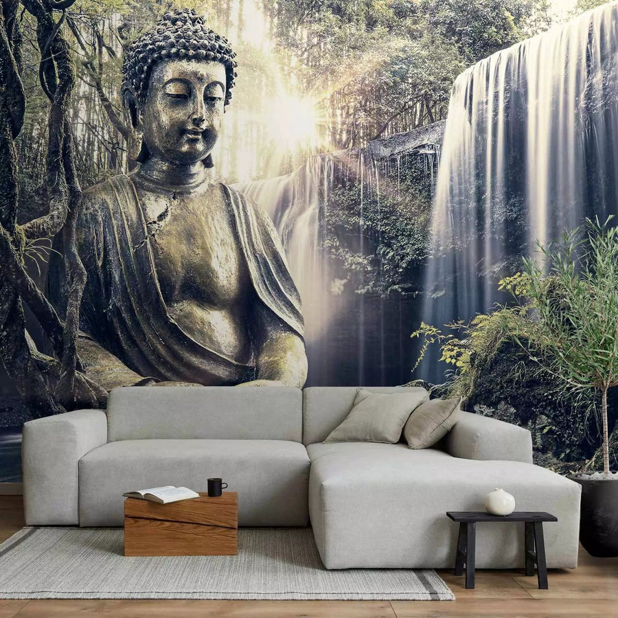 Fototapetes - Budas statuja Āzijas dabas skaistumā, ūdenskritums G-ART