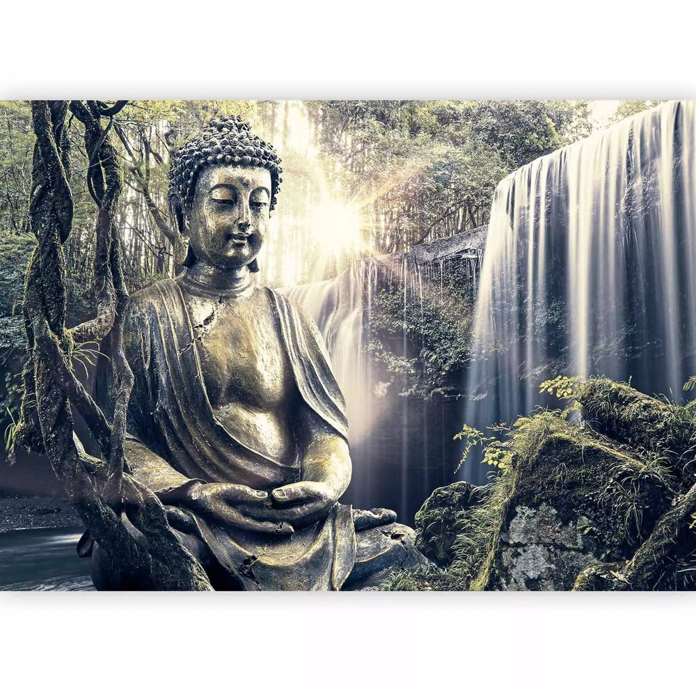 Valokuvatapetti - Buddha veistos vesiputouksen taustalla (vihreä), 90011