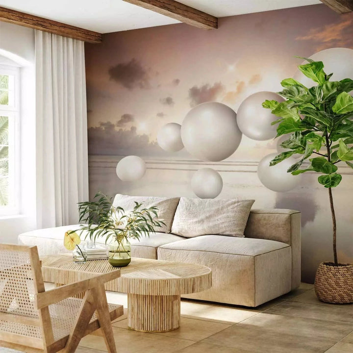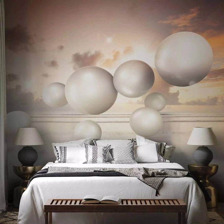 Valokuvatapetti - Abstraktio auringonnousulla - valkoiset helmet lentävät meren yllä, 71237