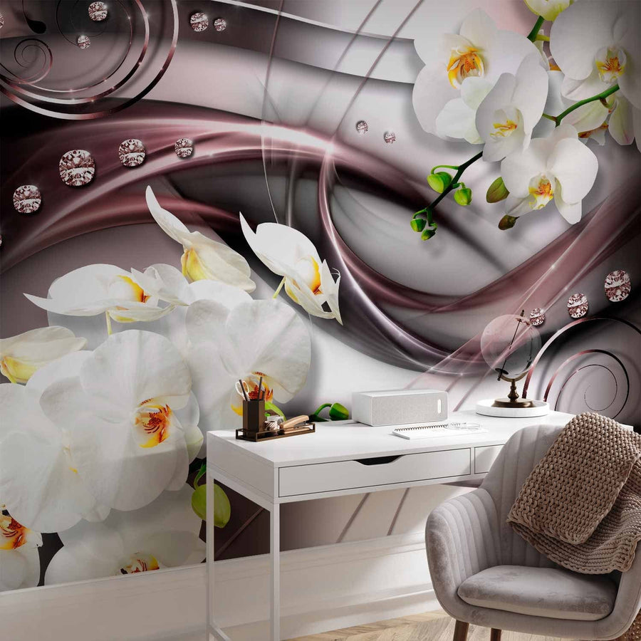 Elegantas fototapetes guamistabai ar baltam orhidejām uz brūna fona G-ART