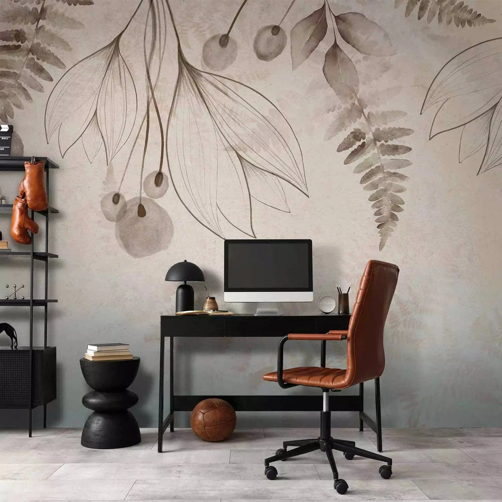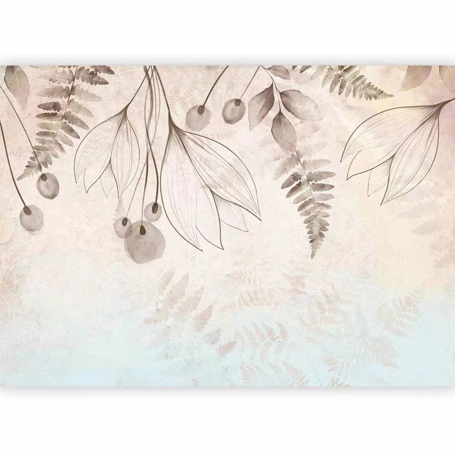 Fototapetes ar zīmētiem ziediem un lapām bēšos toņos G-ART