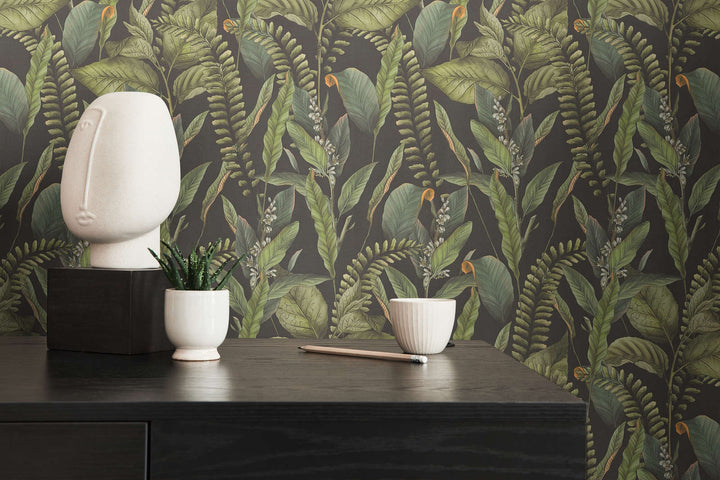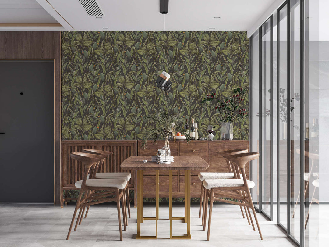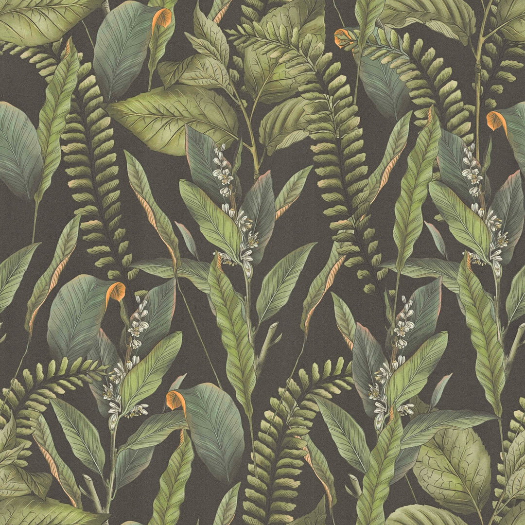 Viidakkotapetti lehdillä ja kukilla, kuvioitu ja matta, 1401623
