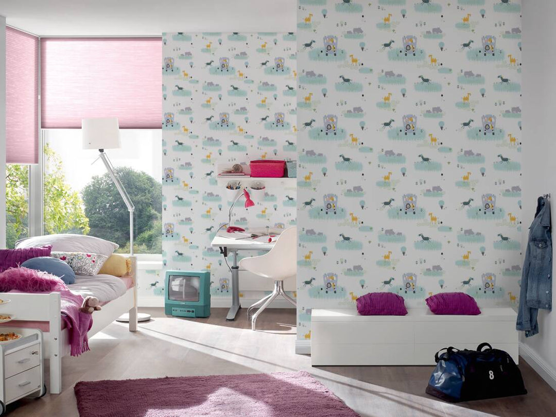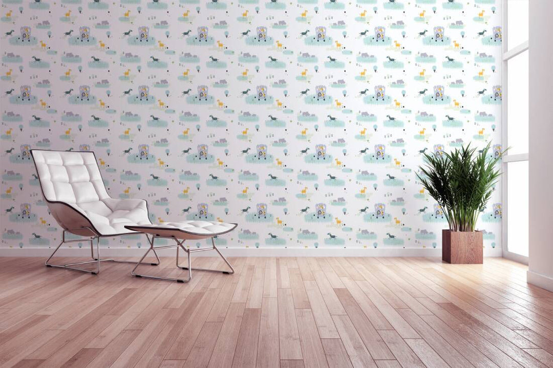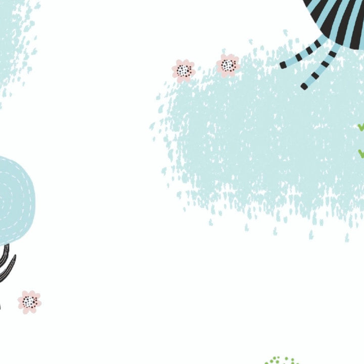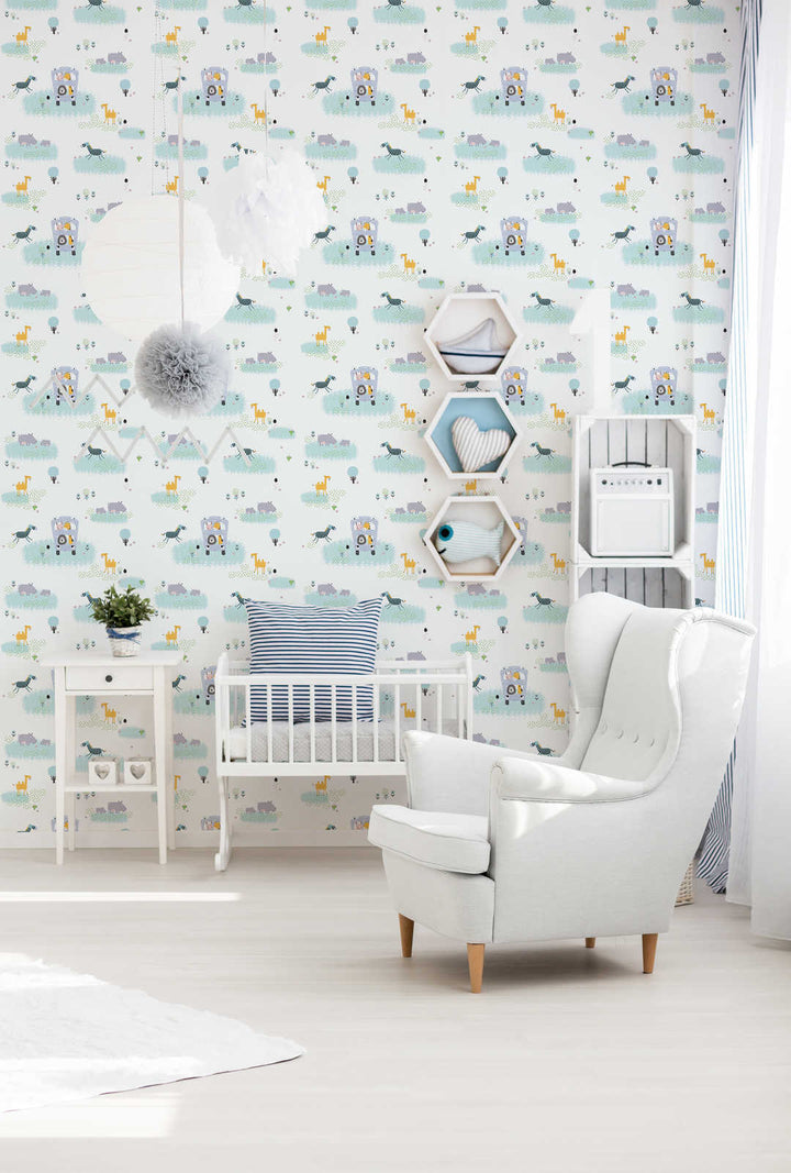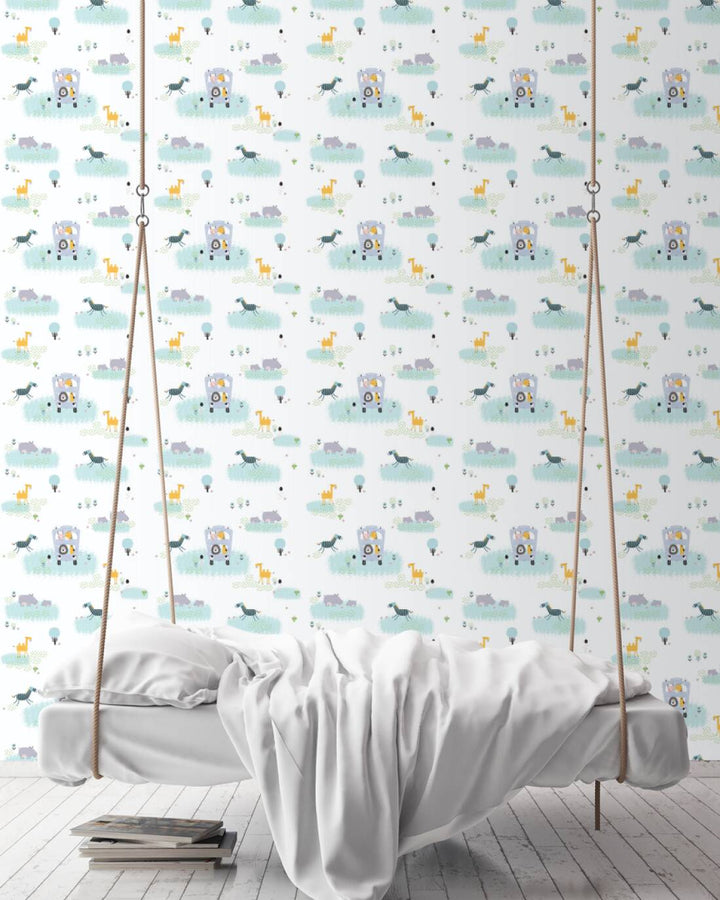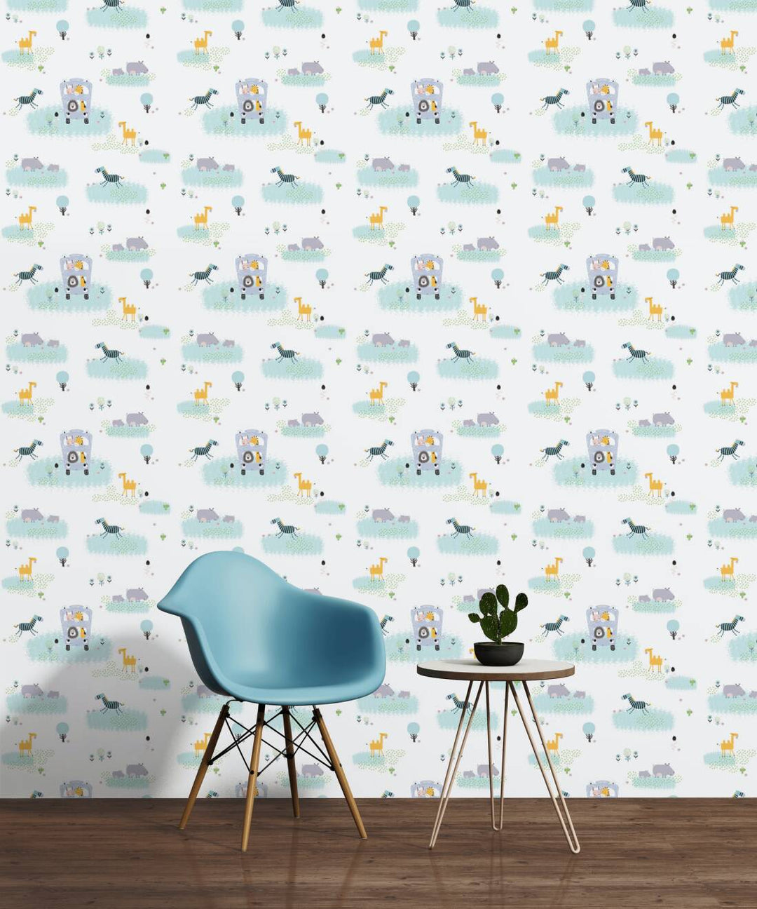 Tapetti, jossa on kameleita, norsuja, virtahepoja ja seeproja sinisen sävyissä valkoisella pohjalla.