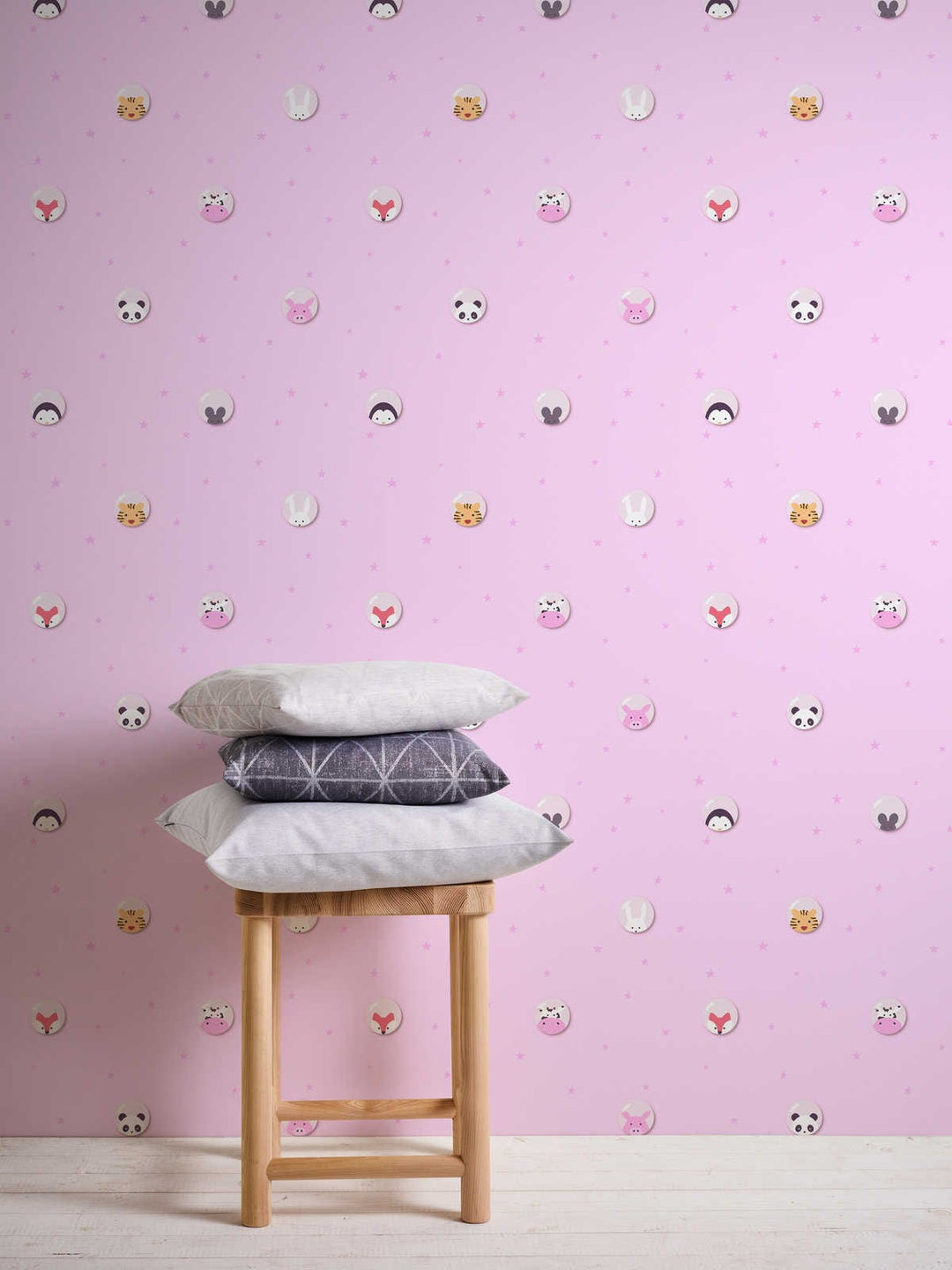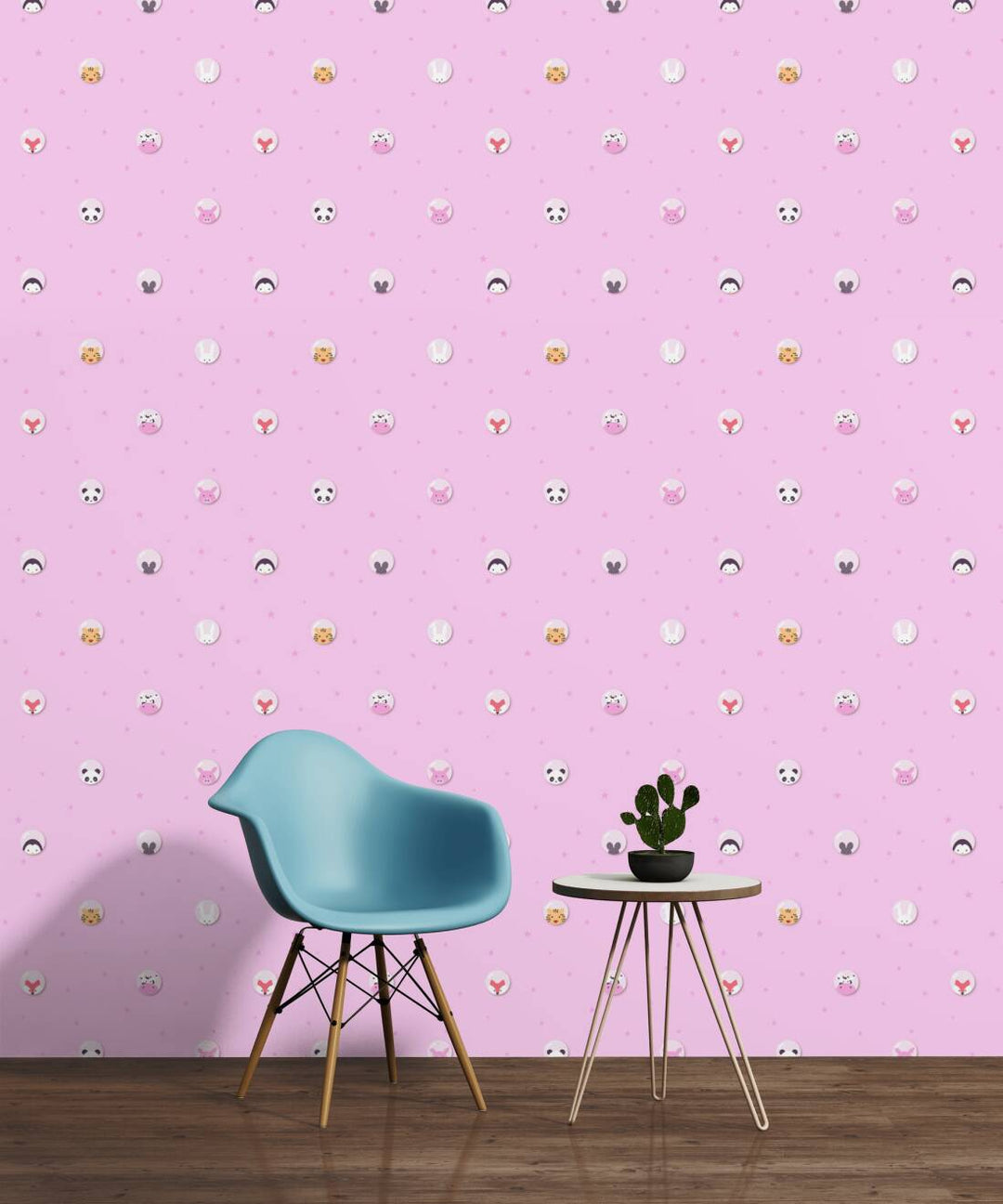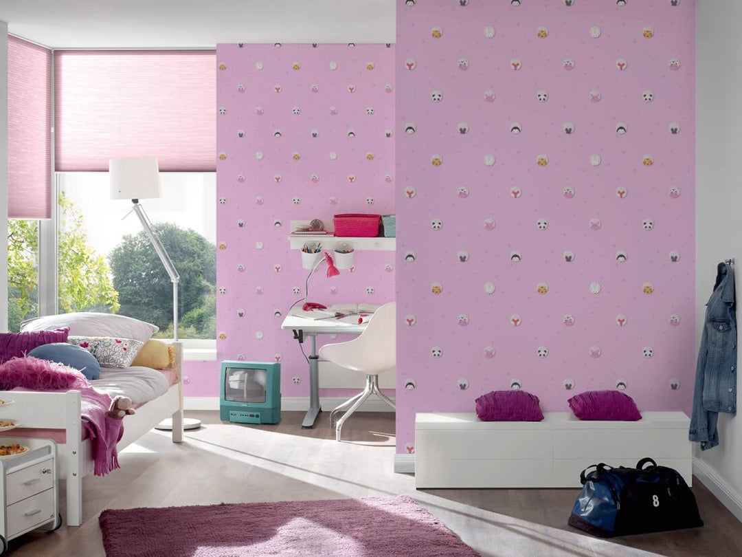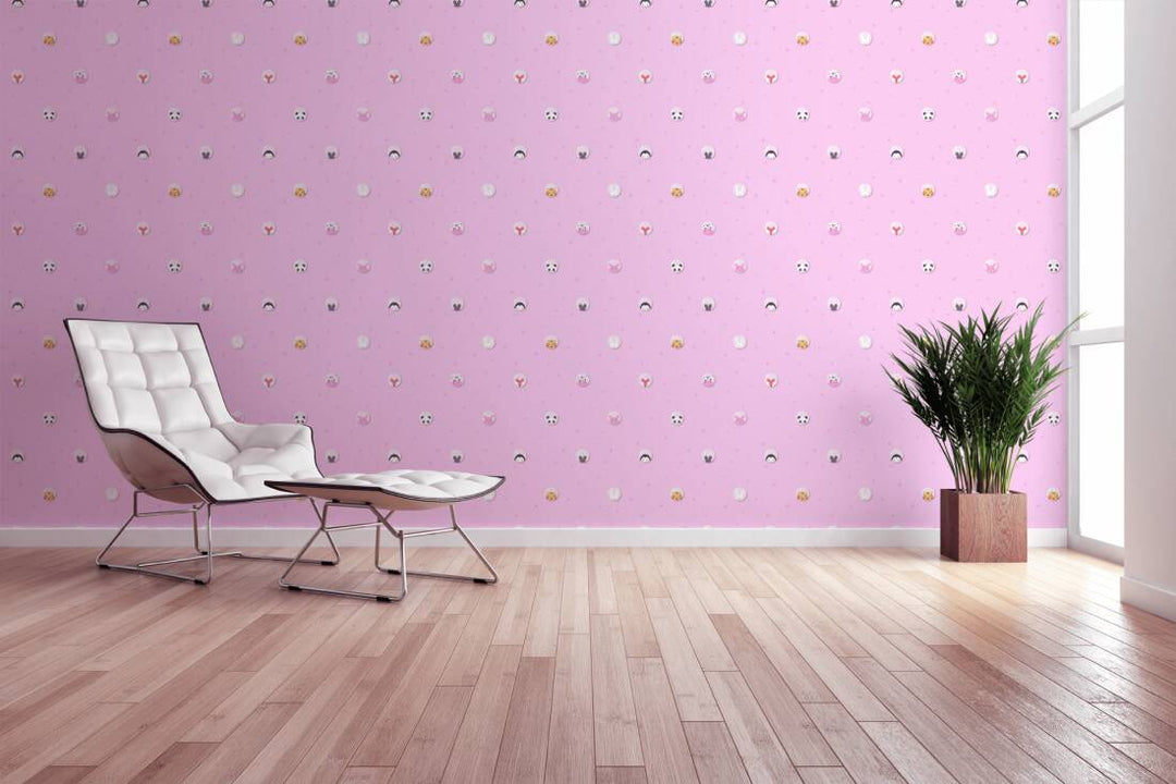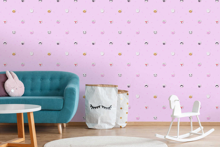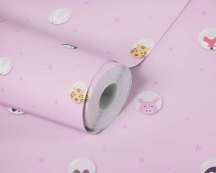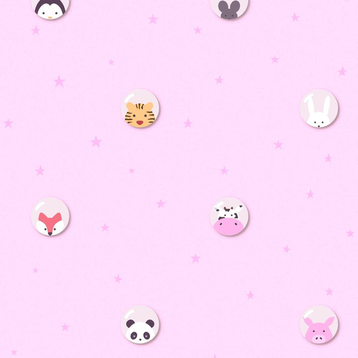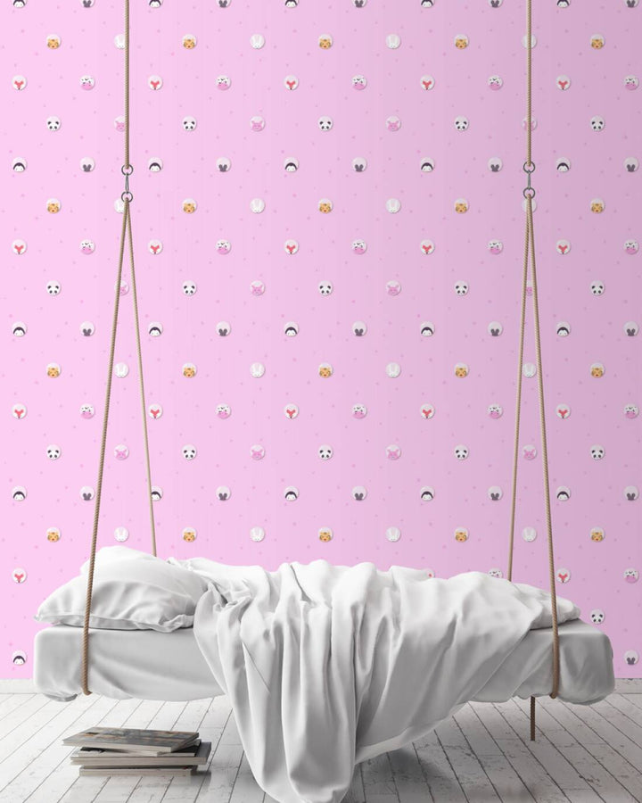 Tapetti, jossa pandoja, tiikereitä, hiiriä, tiikereitä, kettuja, lehmiä ja söpöjä possuja vaaleanpunaisella pohjalla. Tapetti sopii täydellisesti tyttöjen lastenhuoneeseen.