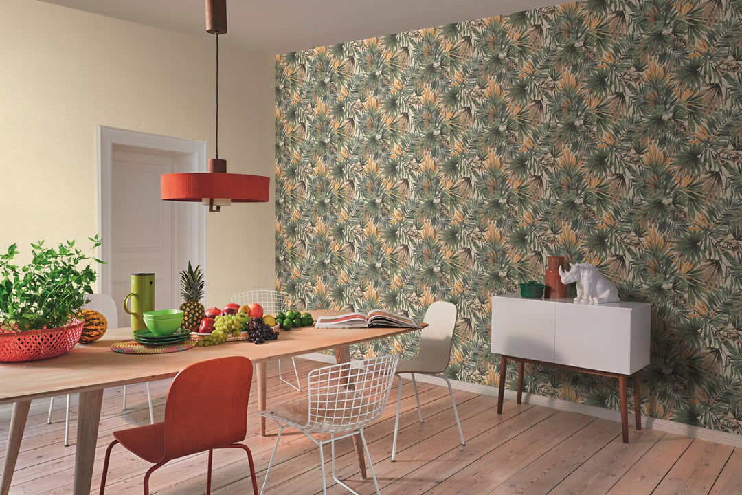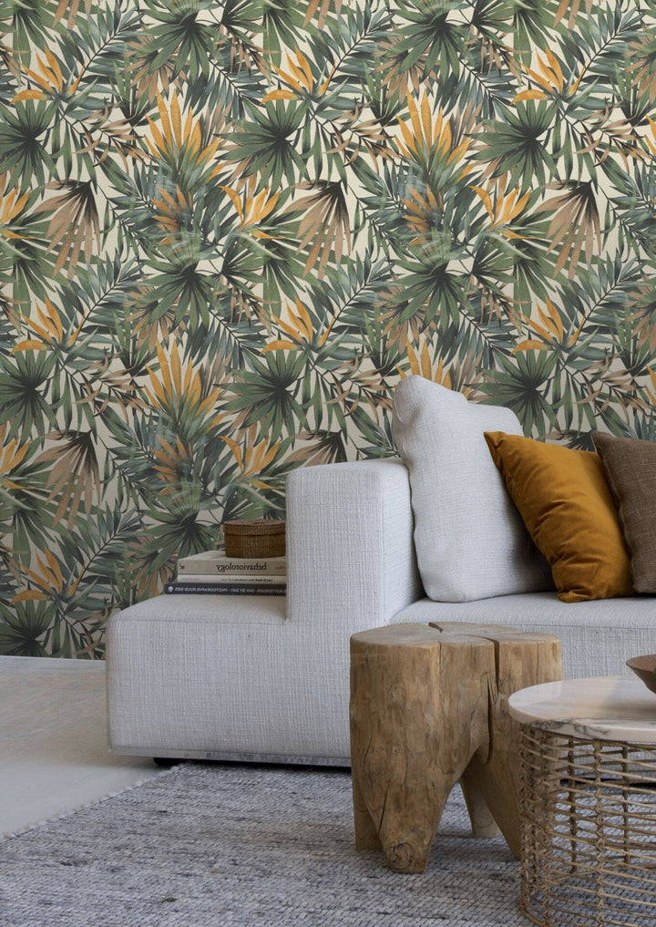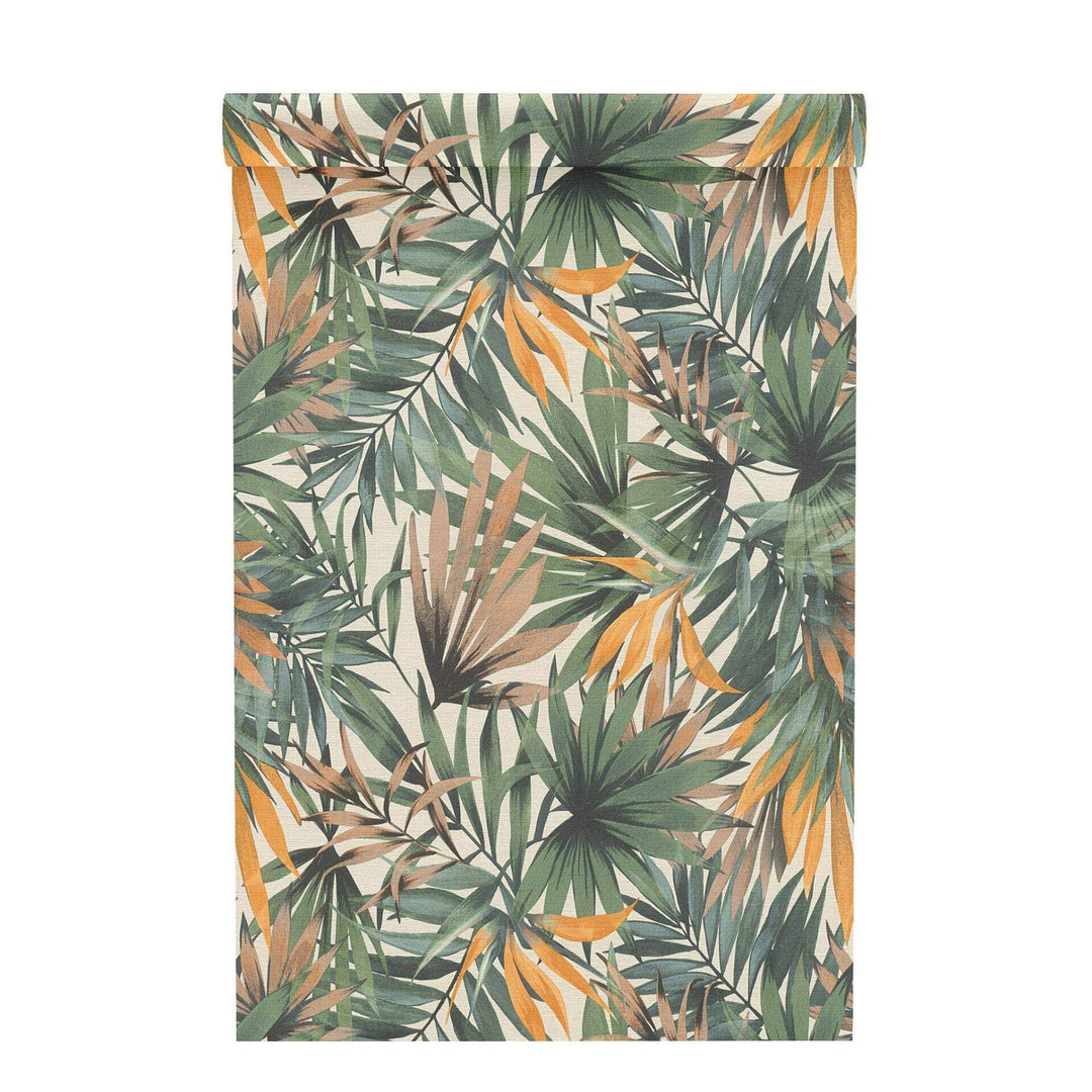 Tästä eteenpäin elämme luonnossa! Palmujen avulla tämä unelma voidaan toteuttaa lyhyessä ajassa. Erilaiset lehtivärit - vihreä ja oranssi - tekevät aiheesta hyvin luonnollisen ja vilkkaan. Hieno pellavakuvio parantaa vaikutelmaa. Tämä on tapa elää.