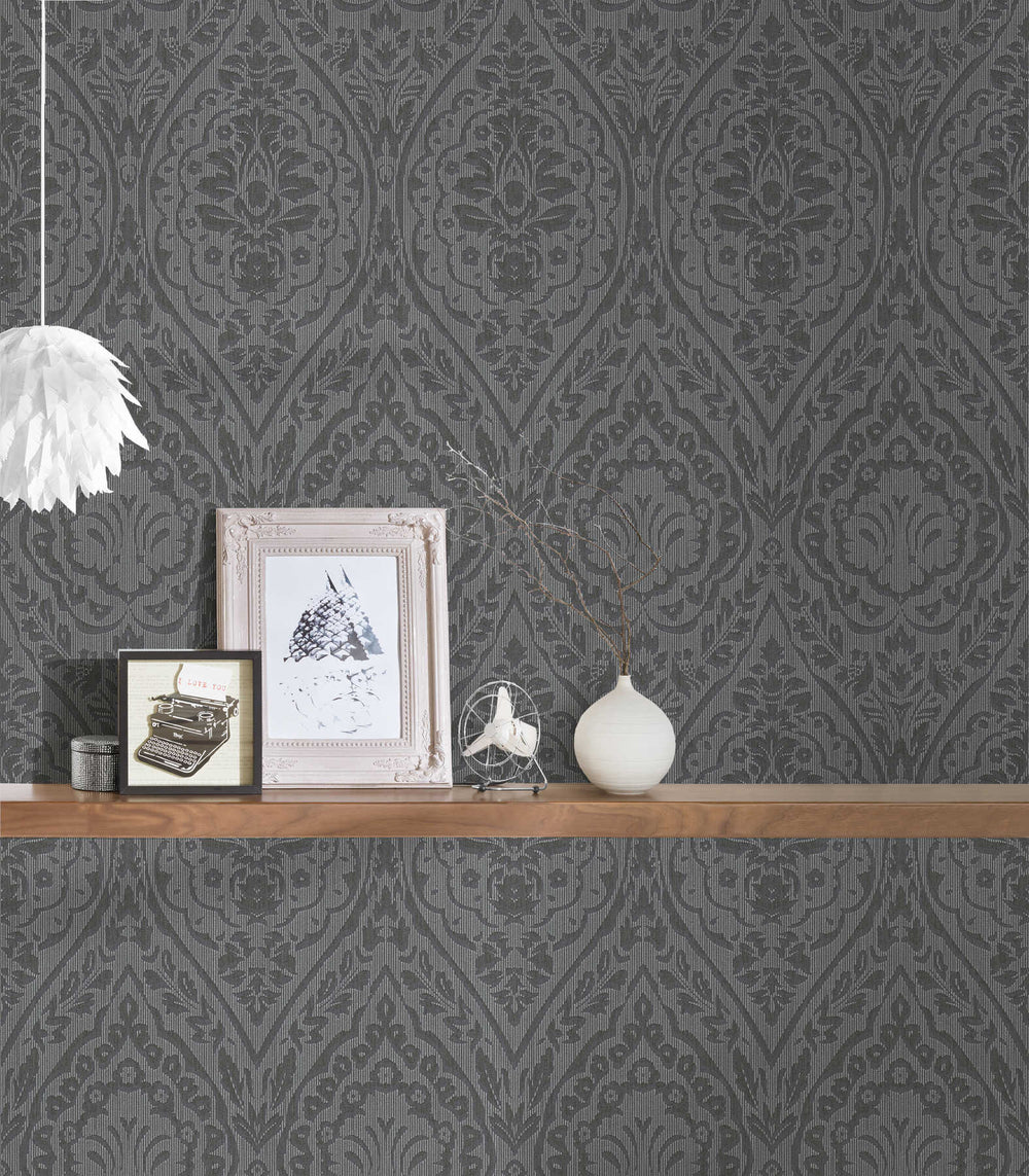 Harmaa tapetti, jossa on metallinhohtoinen kiilto ja viivatekstiili