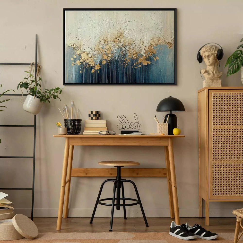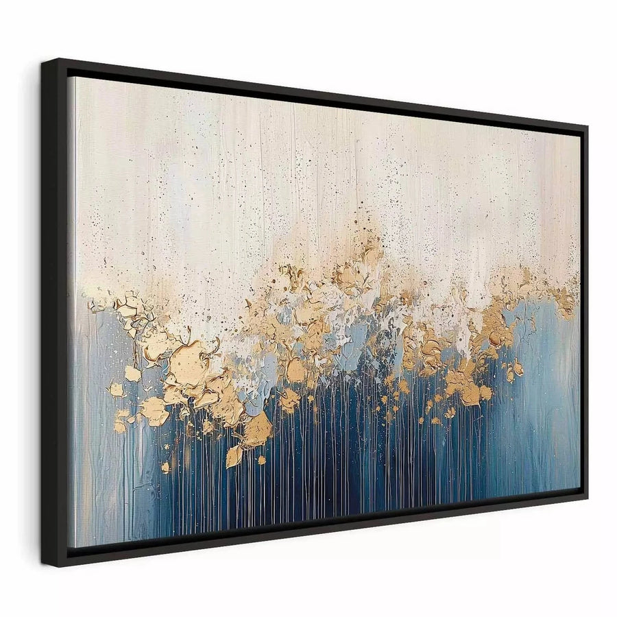 Maalaus mustassa puukehyksessä - kultainen abstraktio sinisellä pohjalla, 162001