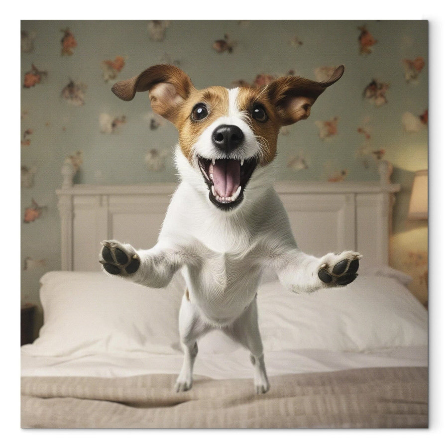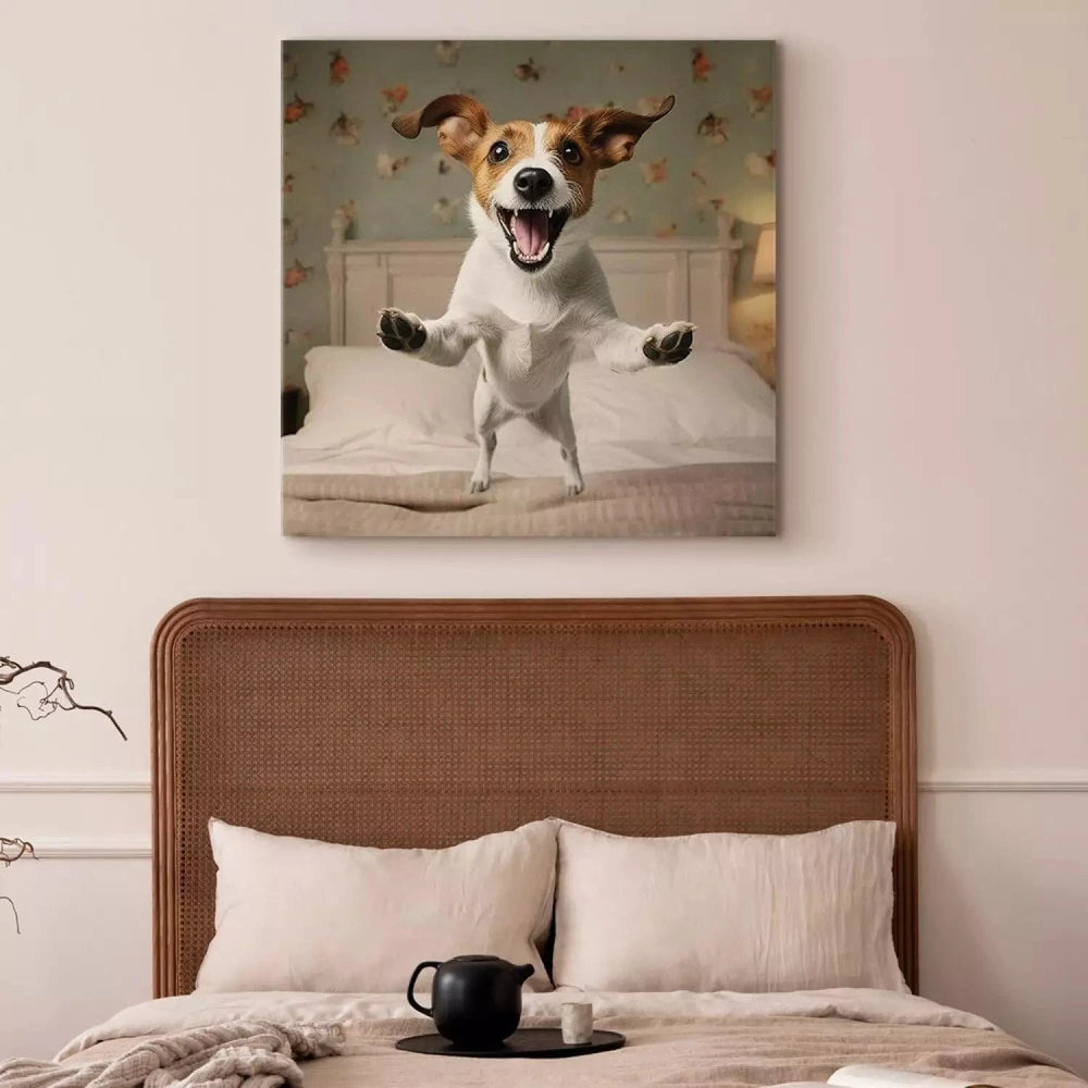Canvas-taulut - Jack Russellinterrieri hyppää sängystä omistajansa syliin, 150203