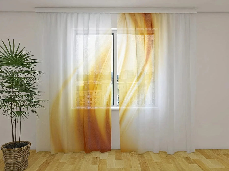 Dienas un nakts aizkari viesistabai ar abstrakta vilni zeltā krāsā Tapetenshop.lv