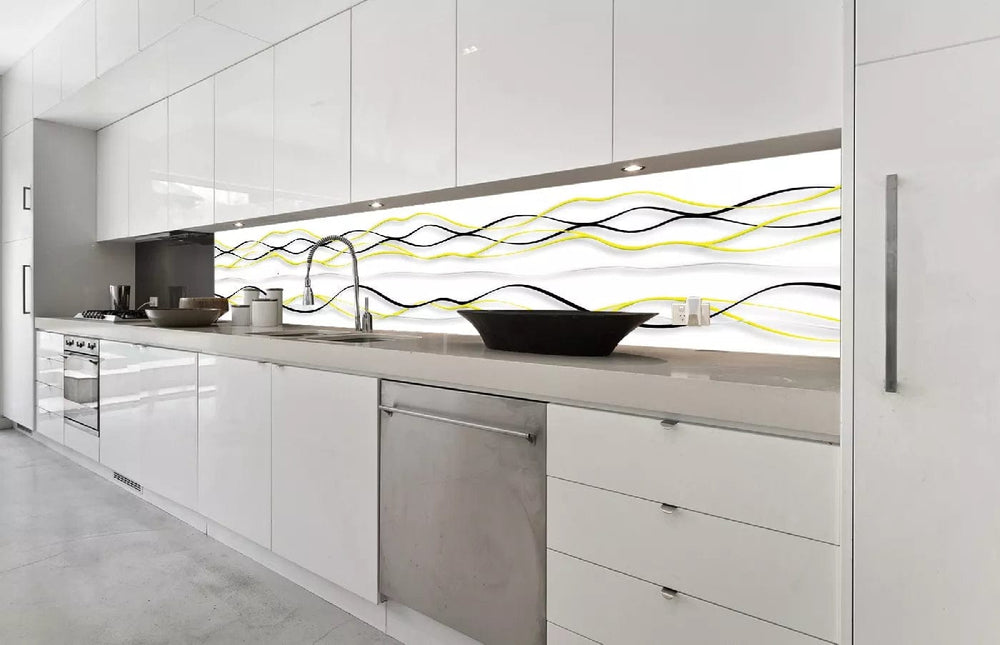 Valokuvatapetti keittiöön laminoinnilla, itseliimautuvalla kalvolla ja flizelineillä - Keltaiset aallot (350x60 cm)