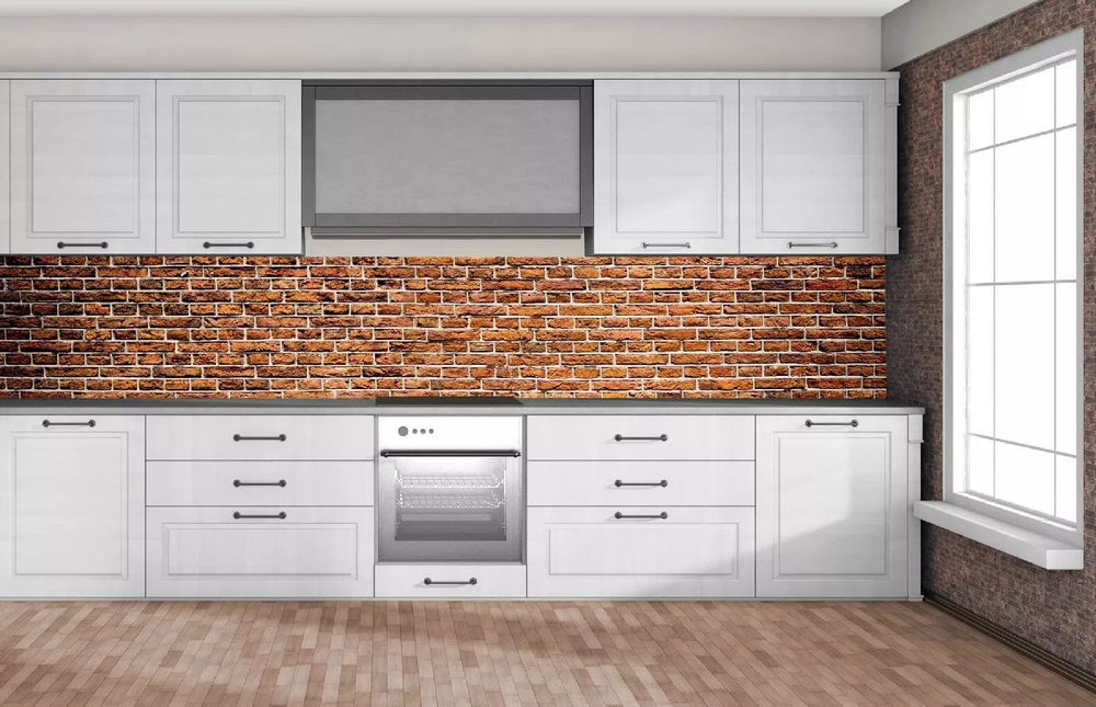 Valokuvatapetti keittiöön laminoinnilla, itseliimautuvalla kalvolla ja flizelineillä - Vanha tiili (350x60 cm)