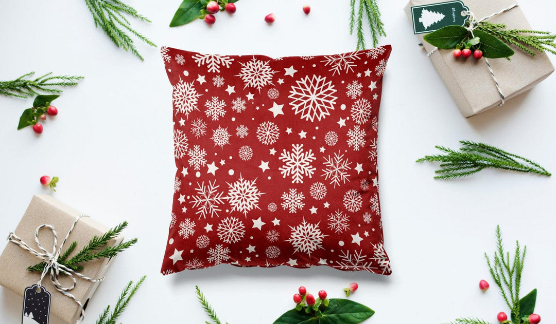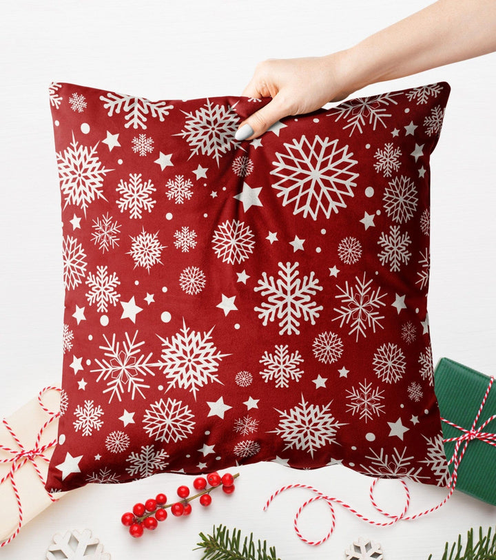 Jouluiset tyynyliinat (veluuri) - Tähdet ja lumihiutaleet, valkoinen sisustus punaisella pohjalla