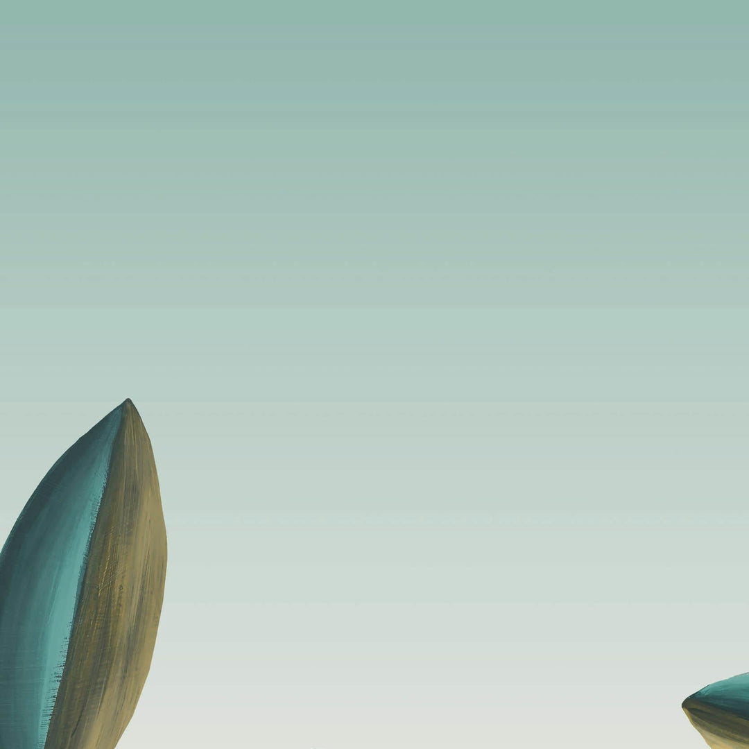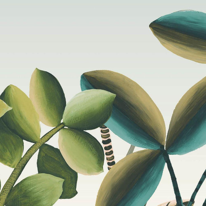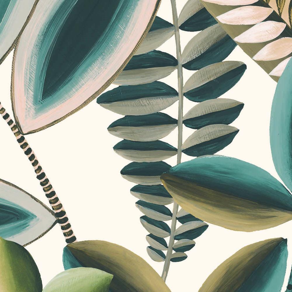 Tässä kasvitieteen maailma kohtaa unenomaisen graafisen suunnittelun. Eri muotoiset ja kokoiset tyylitellyt lehdet tekevät mistä tahansa seinästä mielikuvituksellisen puutarhan paratiisin. Sinisestä valkoiseen vaihtelevaa taustaa vasten kasvit on kuvattu kauniisti eri sävyisinä, lehtivihreästä ja turkoosinsinisestä oliivinvihreään ja persikkaiseen, mikä luo silmiinpistävän kontrastin.