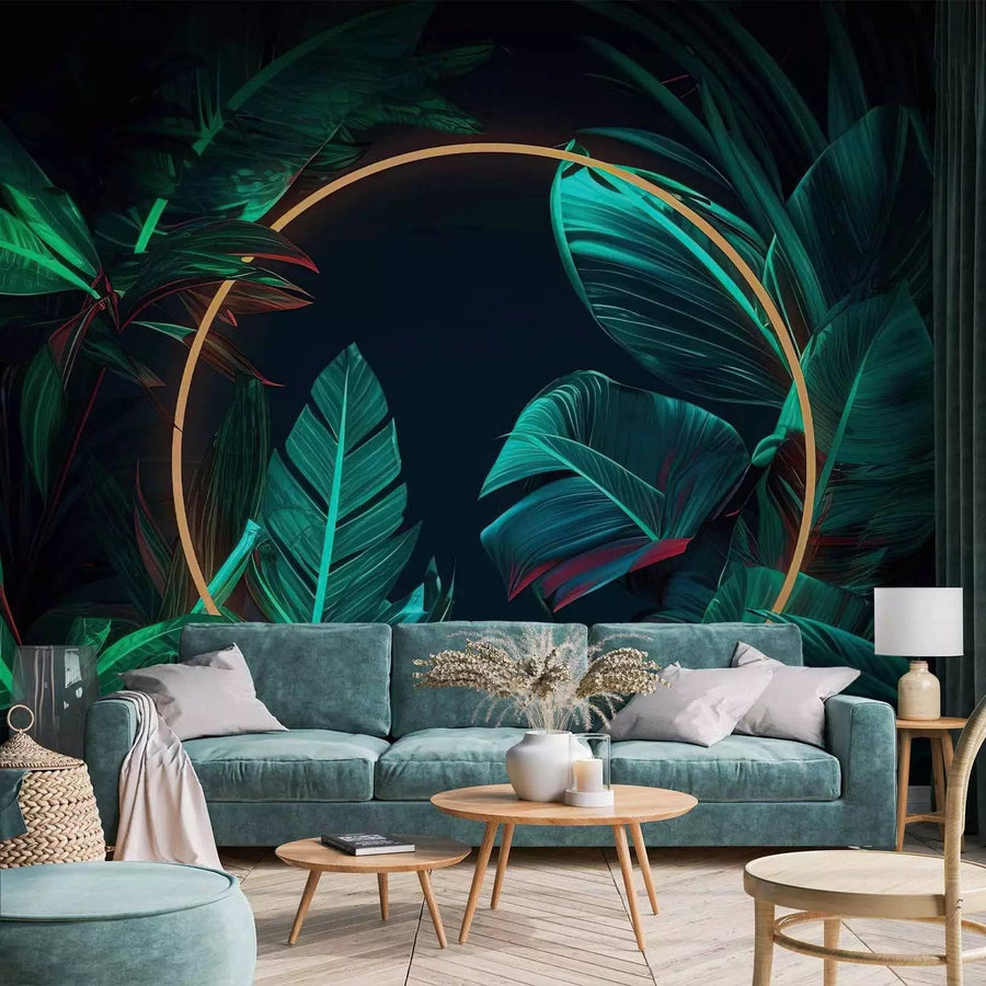 Fototapetes ar džungļiem - Tropu lapas ar neona zelta apli, 150665 G-ART
