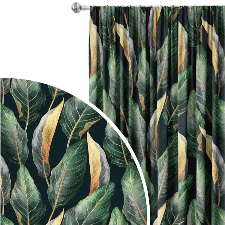 Dekoratīvie Dienas un nakts aizkari - - Tropu raksts ar zaļam lapām un zeltu uz tumša fona, 147291 Tapetenshop.lv