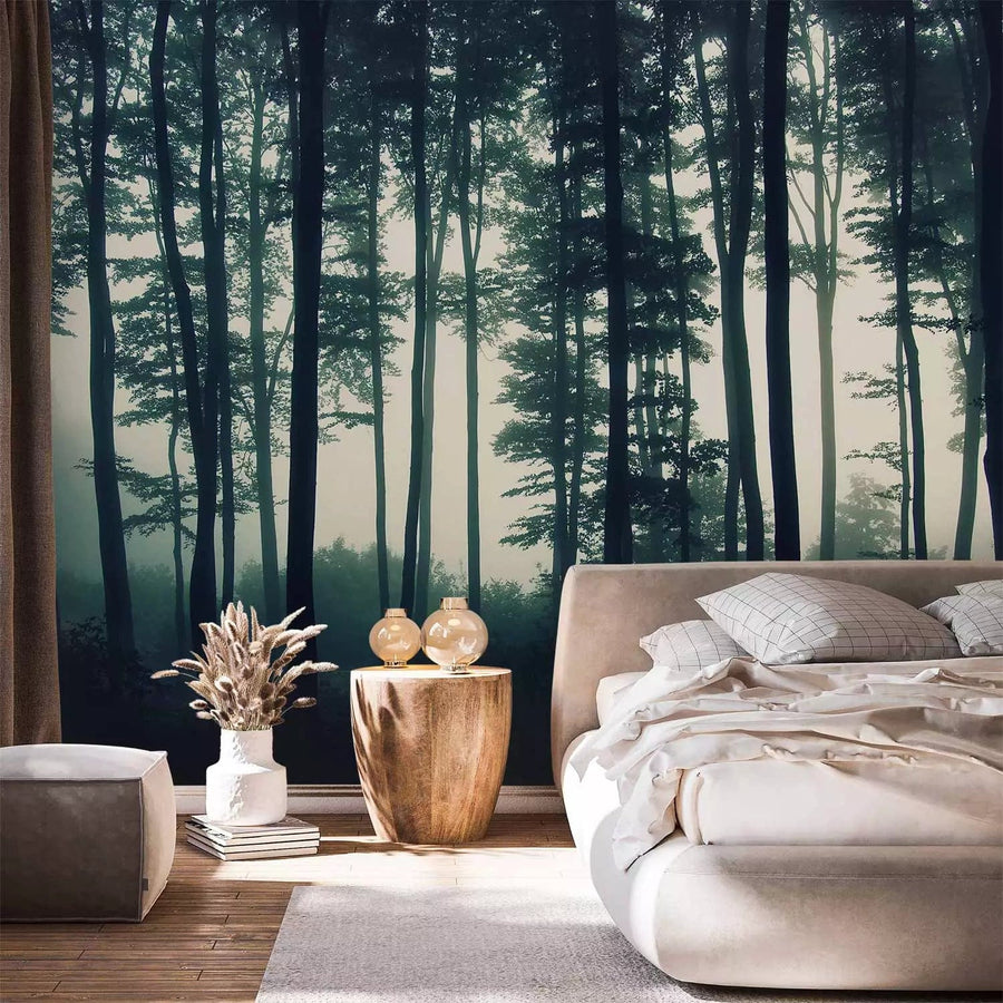 Fototapetes ar skaistu miglainu mežu tumši zaļos toņos, 94799 G-ART