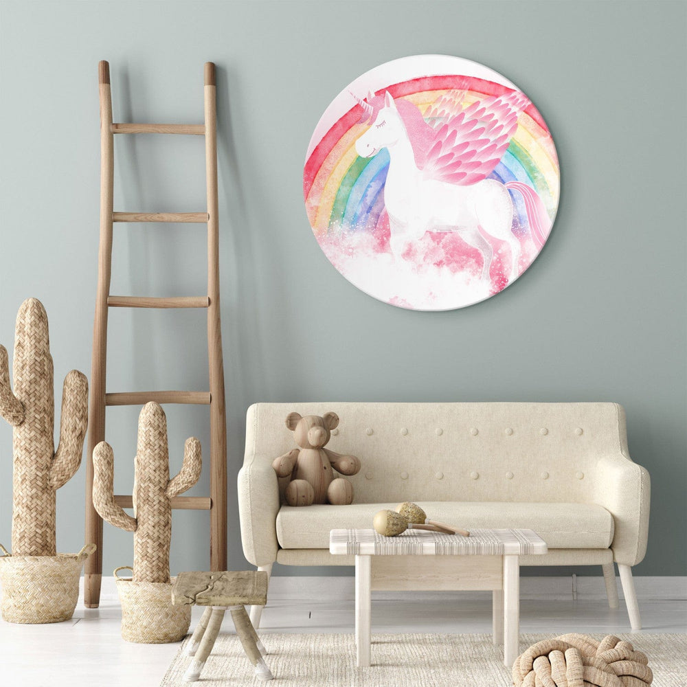 Pyöreä сanvas-taulut lastenhuoneelle (Deluxe) - Yksisarvinen ja sateenkaari vaaleanpunaisella taustalla, 148684