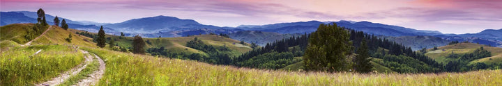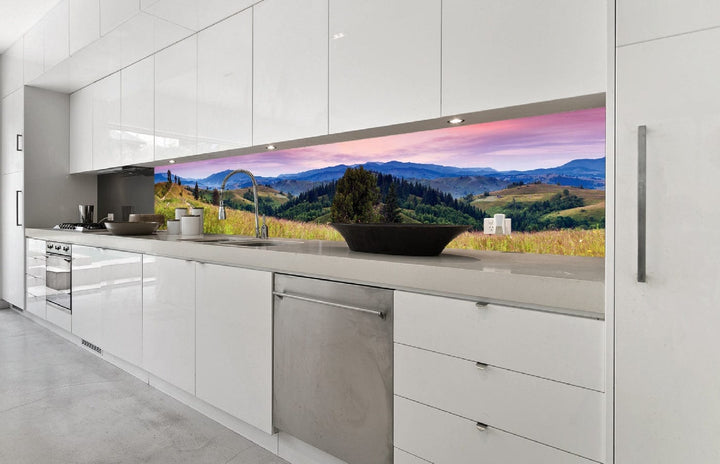 Valokuvatapetti keittiöön laminoinnilla, itseliimautuvalla kalvolla ja flizelineillä - Blooming mountains (350x60 cm)