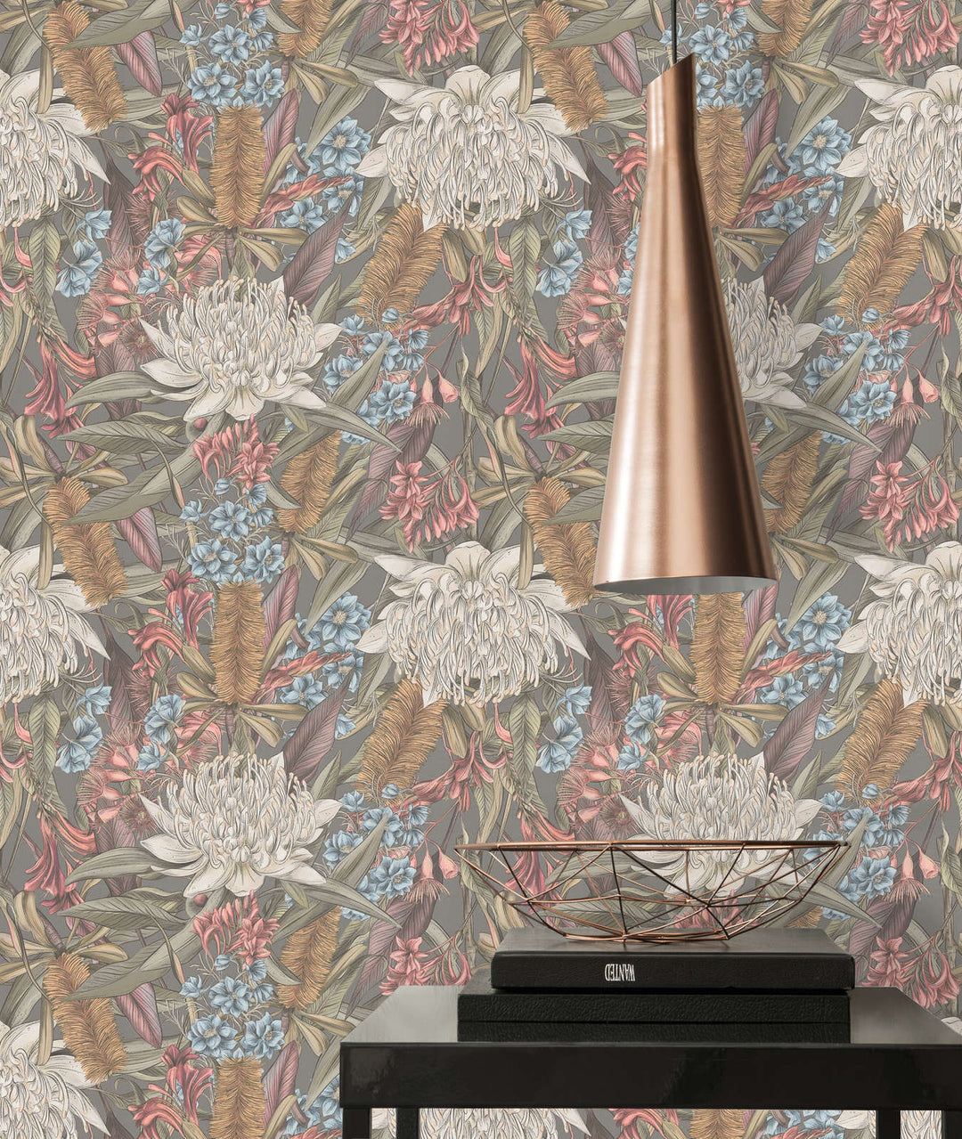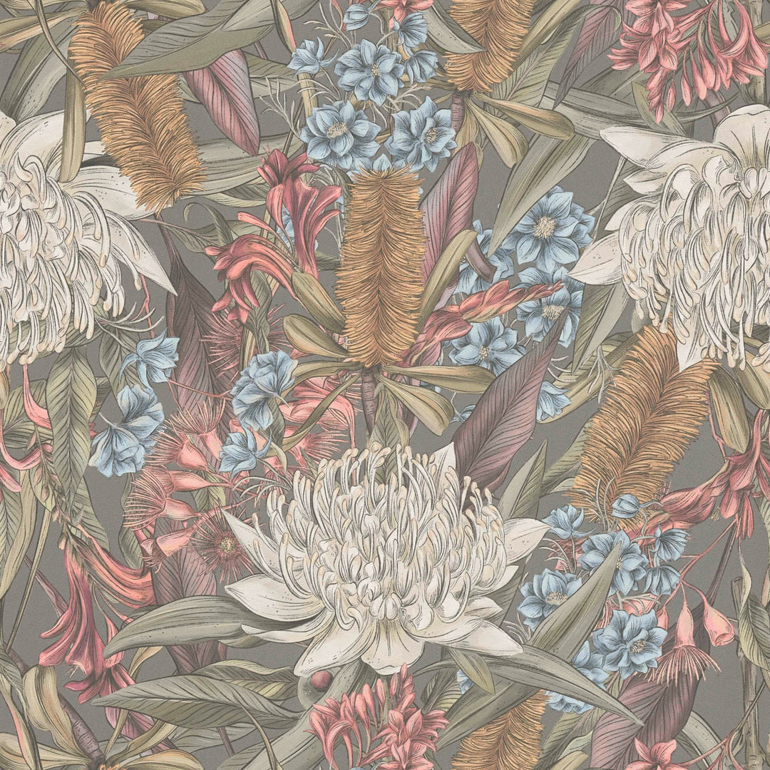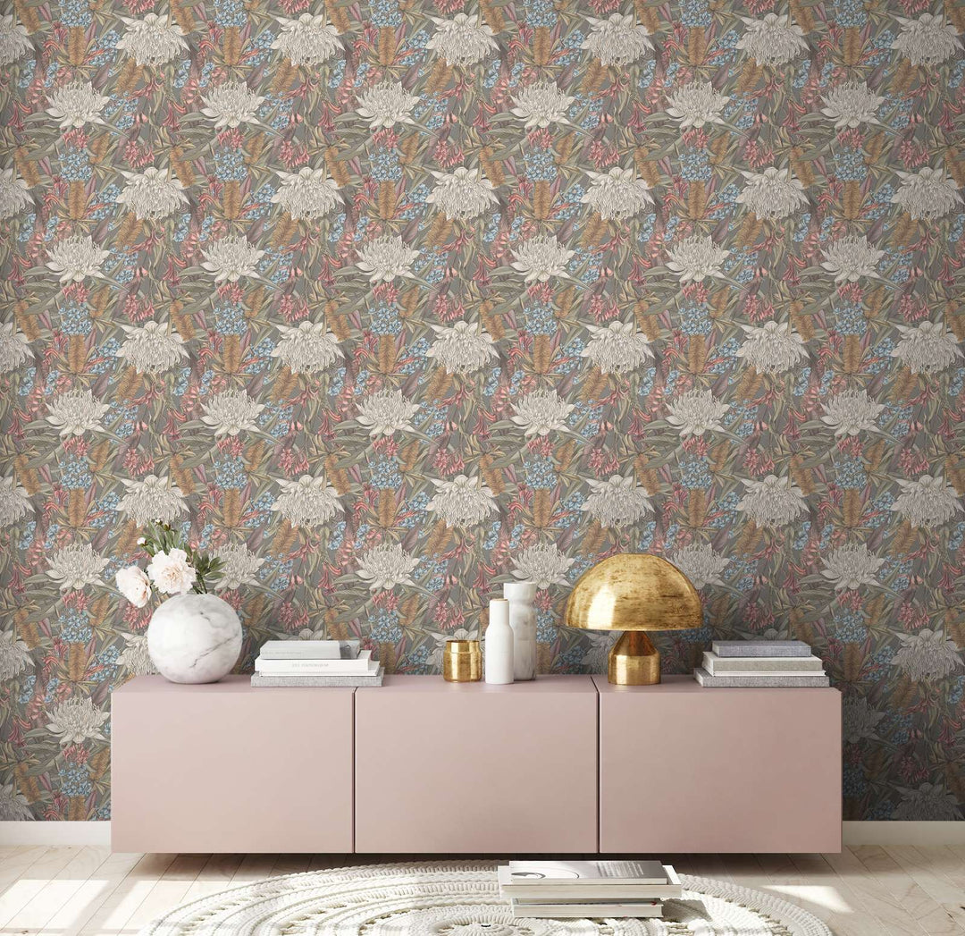 Viidakko kukka tapetti lehdet ja kukat: vihreä vaaleanpunainen, 1402053