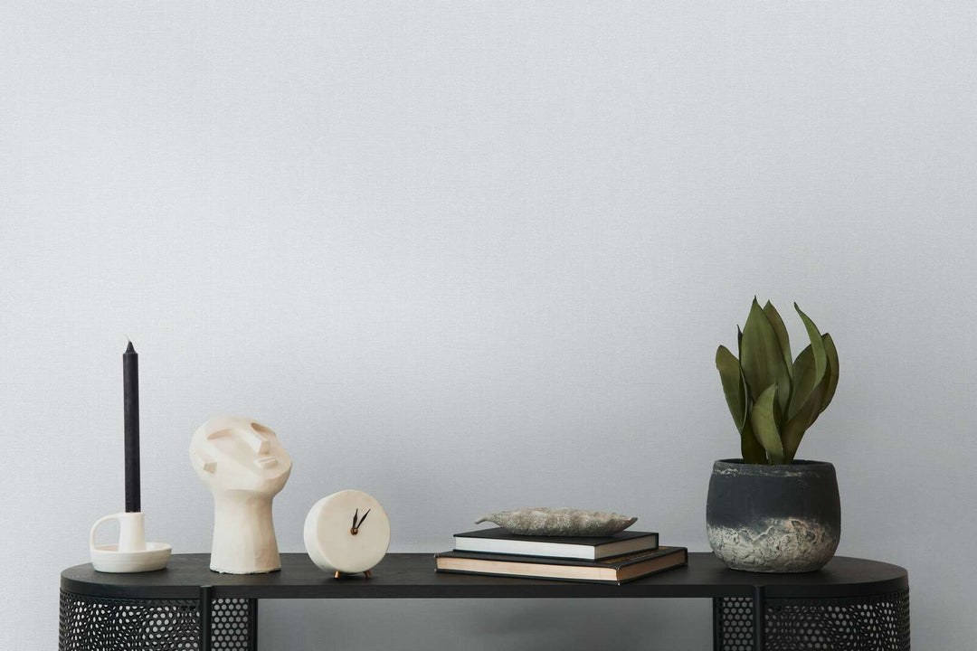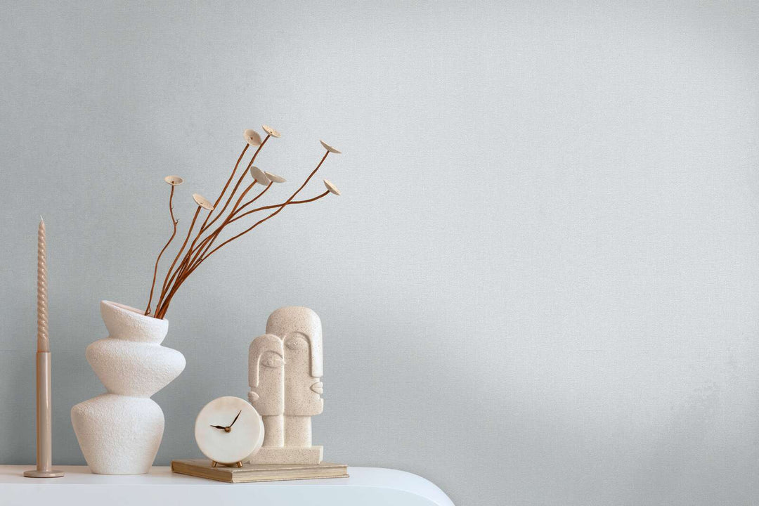 Gaiši pelēkas tapetes ar teksturētu faktūru piešķir sienām smalku dziļumu un harmonisku minimālisma akcentu mūsdienīgā interjerā.