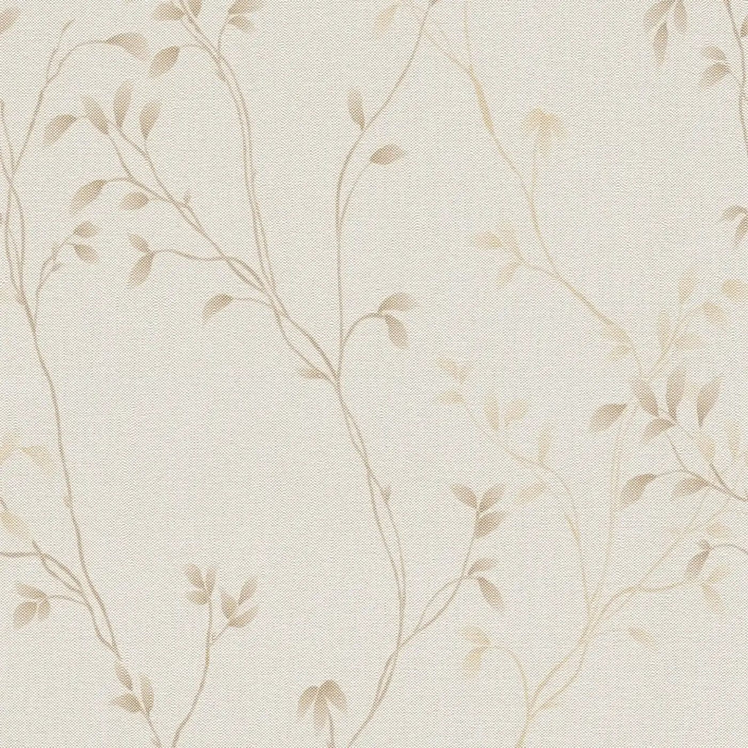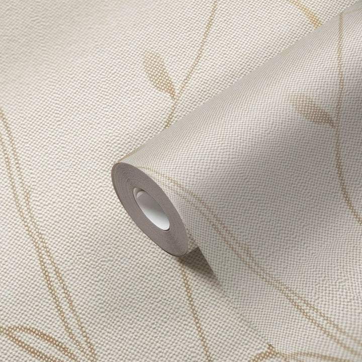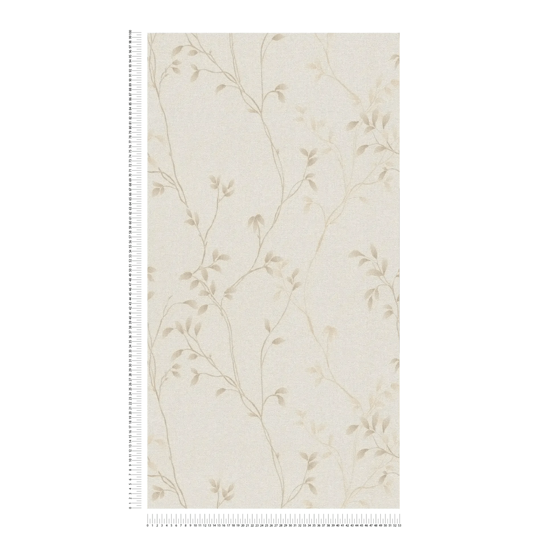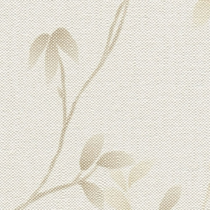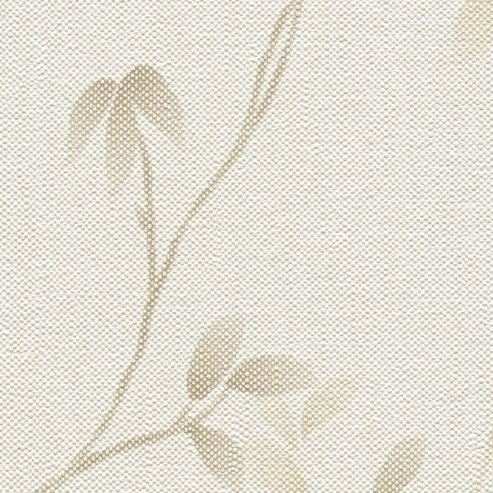Flizelīna tapetes ar smalkiem zariņiem un lapām uz auduma tekstūras bēšos toņos (1410547), izmērs 0,53x10 m. Flizelīna materiāls ar smalku tekstūru un matētu virsmu – dabisks un mierīgs fons Jūsu interjeram.