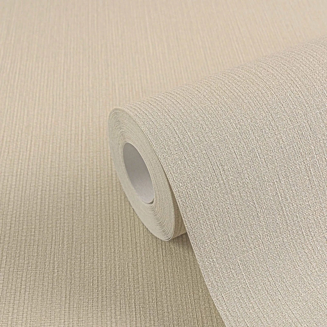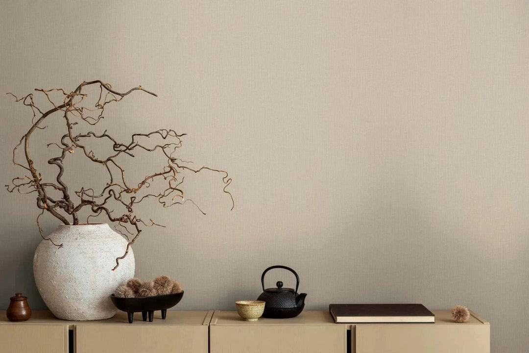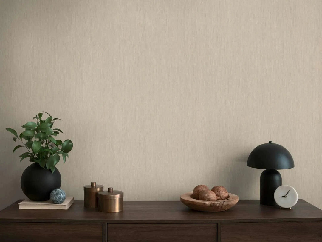 Beige fleecetapetti, jossa on kangasvaikutelma, antaa seinillesi lämpimän ja klassisen ilmeen.