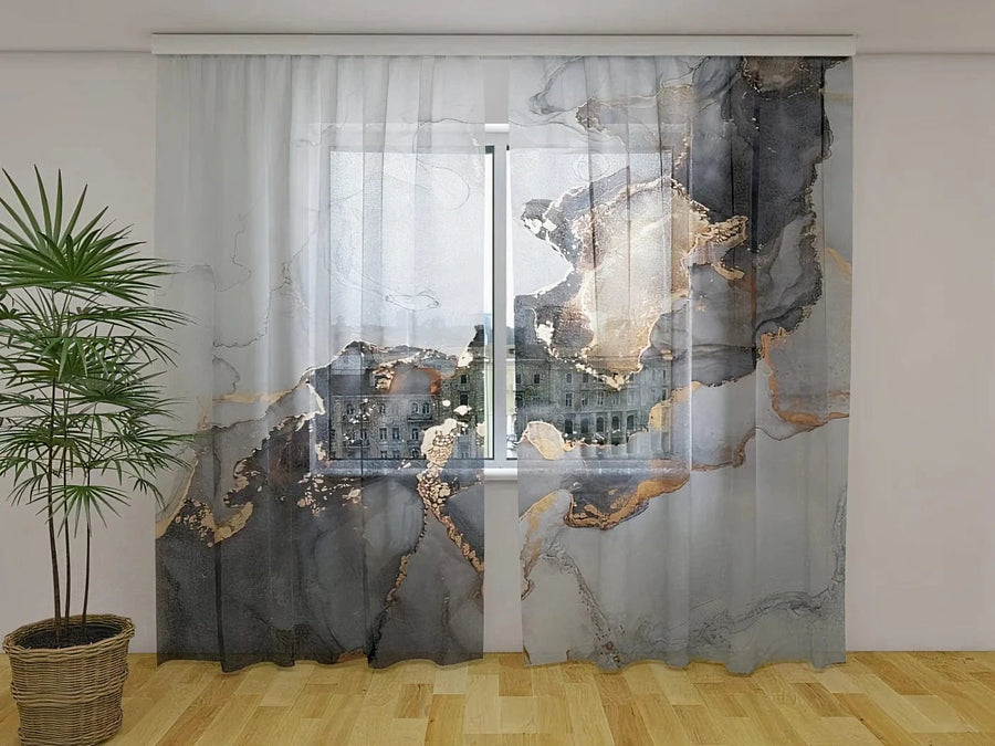 Dienas un nakts aizkari ar marmora rakstu pelēkā, melnā uz zeltā krāsā Tapetenshop.lv