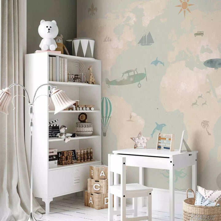 Valokuvatapetti - Lasten kartta - lentokoneita ja eläimiä karttataustalla - 143428