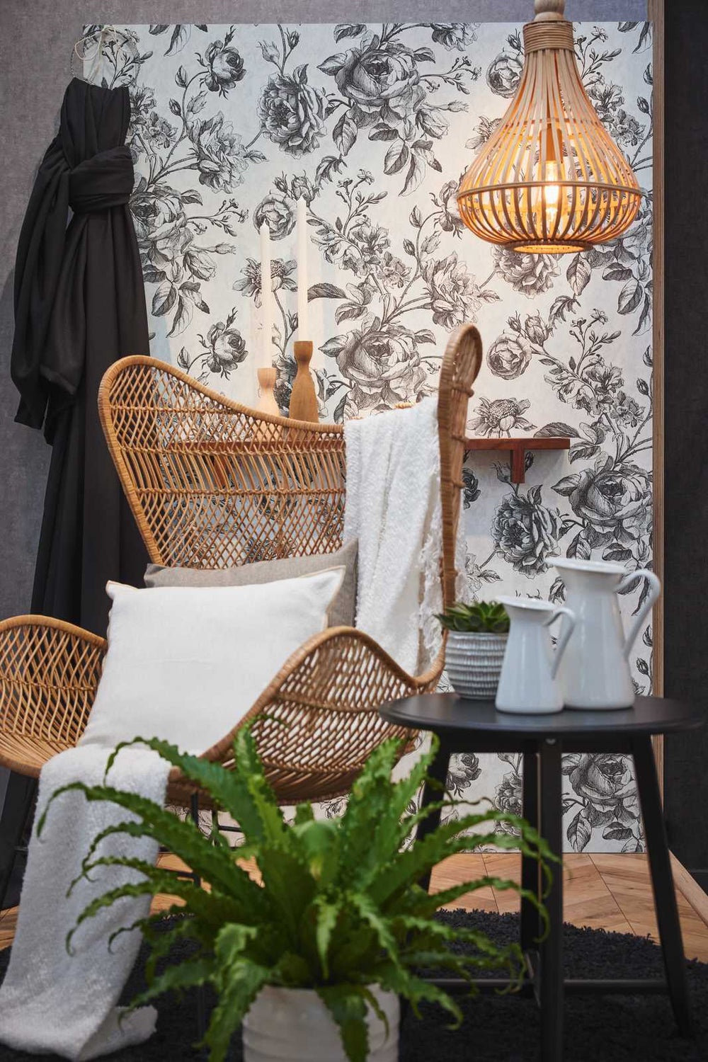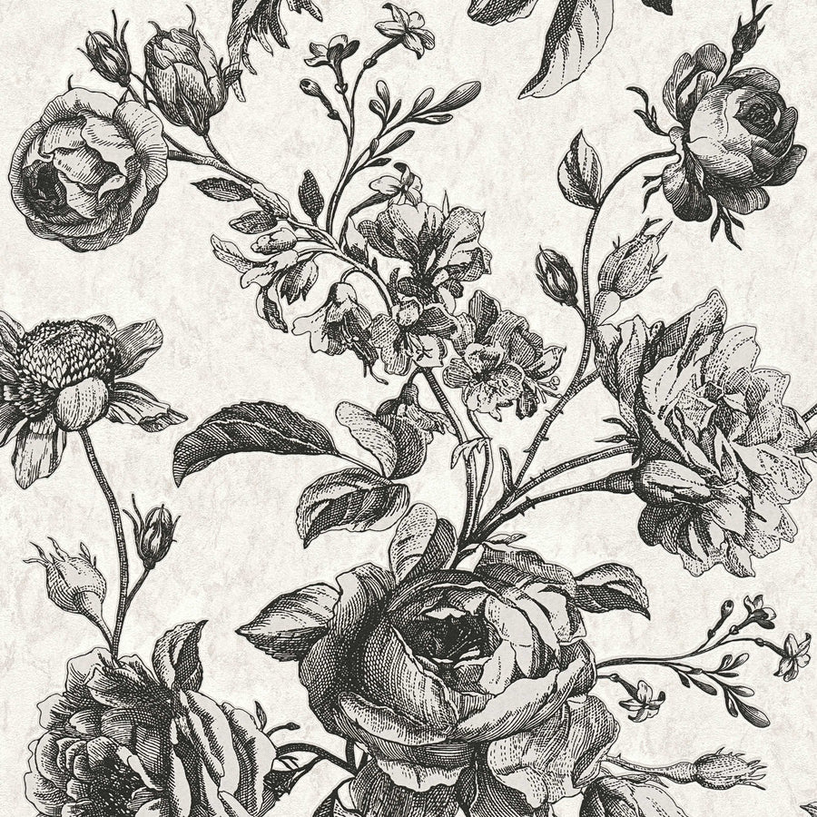 Melnbaltas tapetes ar vintāžas rozēm - 1363672 AS Creation