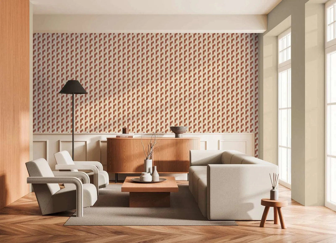 Daniel Hechterin ruskeat ja kermanväriset retro-3D-tapetit luovat tyylikkäitä kontrasteja ja tilallista syvyyttä.