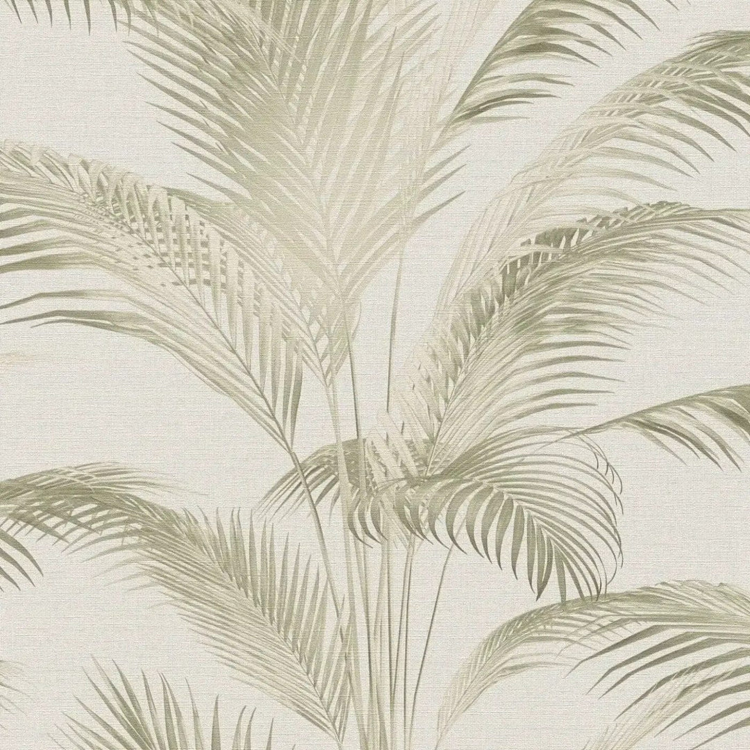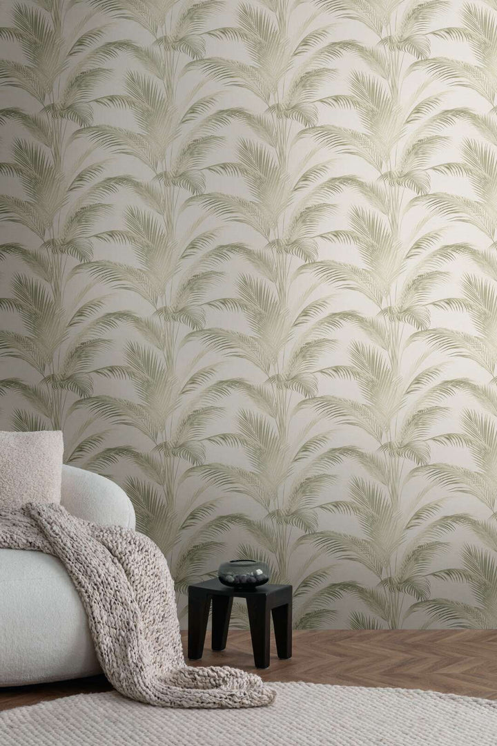 Vihreä ja kermanvärinen vintage-tyylinen flizeline-tapetti palmunlehdillä antaa luonnollisen ja harmonisen tunnelman.