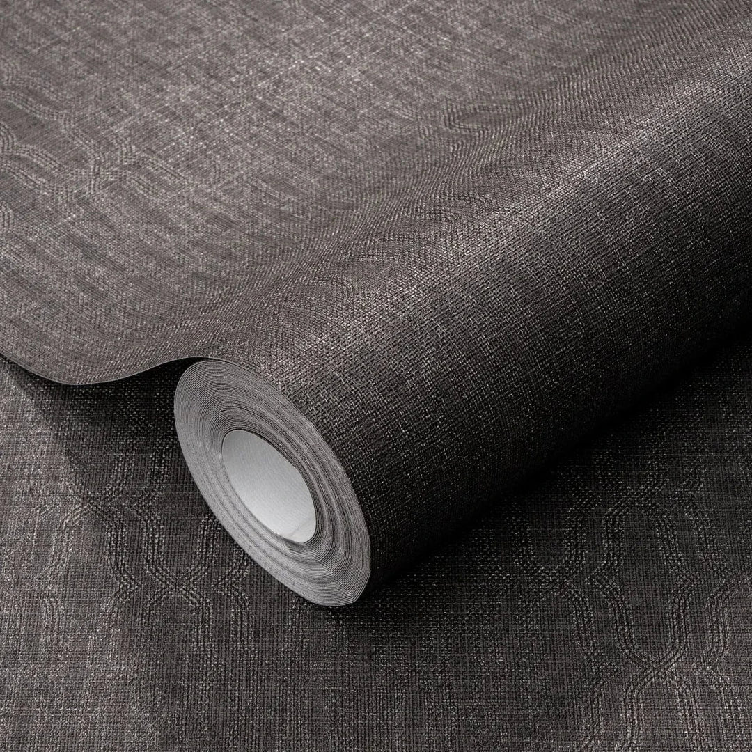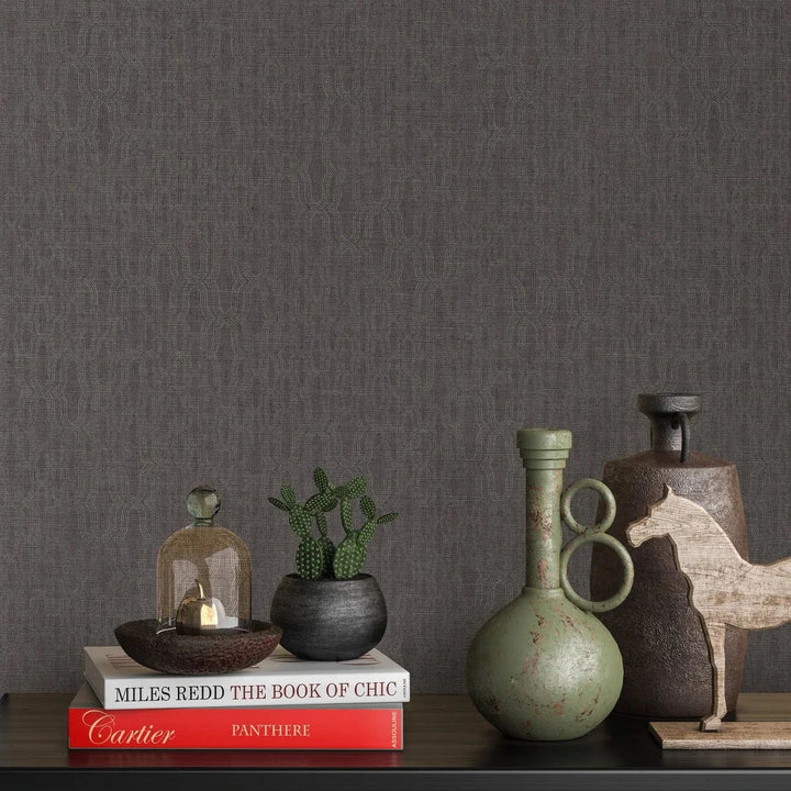 Tummanruskea tapetti koristeilla lisää eleganssia ja klassista ilmettä.