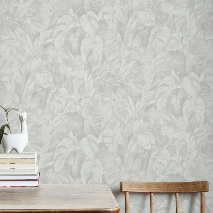 Taustakuva, jossa on piirrettyjä trooppisia lehtiä tekstiilitekstuurilla, harmaa - 3762312