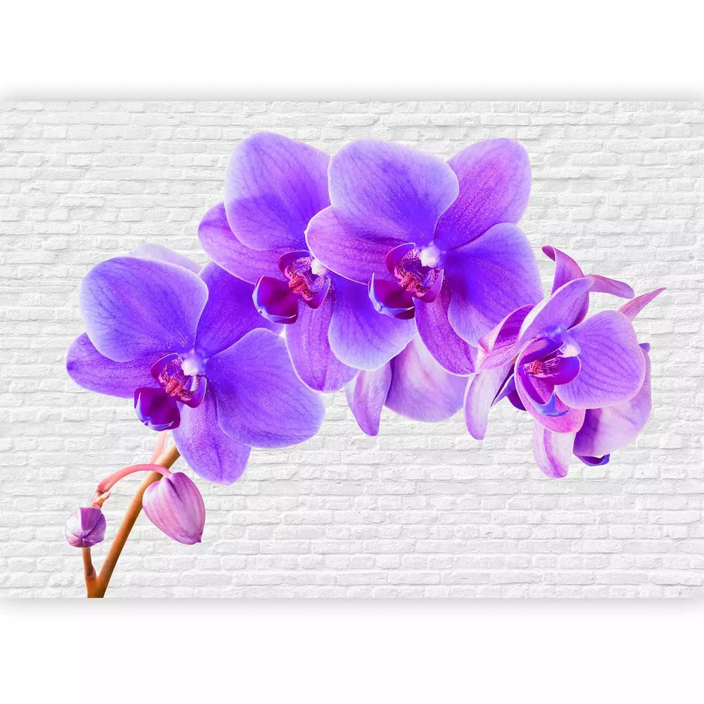 Fototapetes ar violetām orhidejām un ķieģeļu sienu pelēkā krāsā - 60243  G-ART