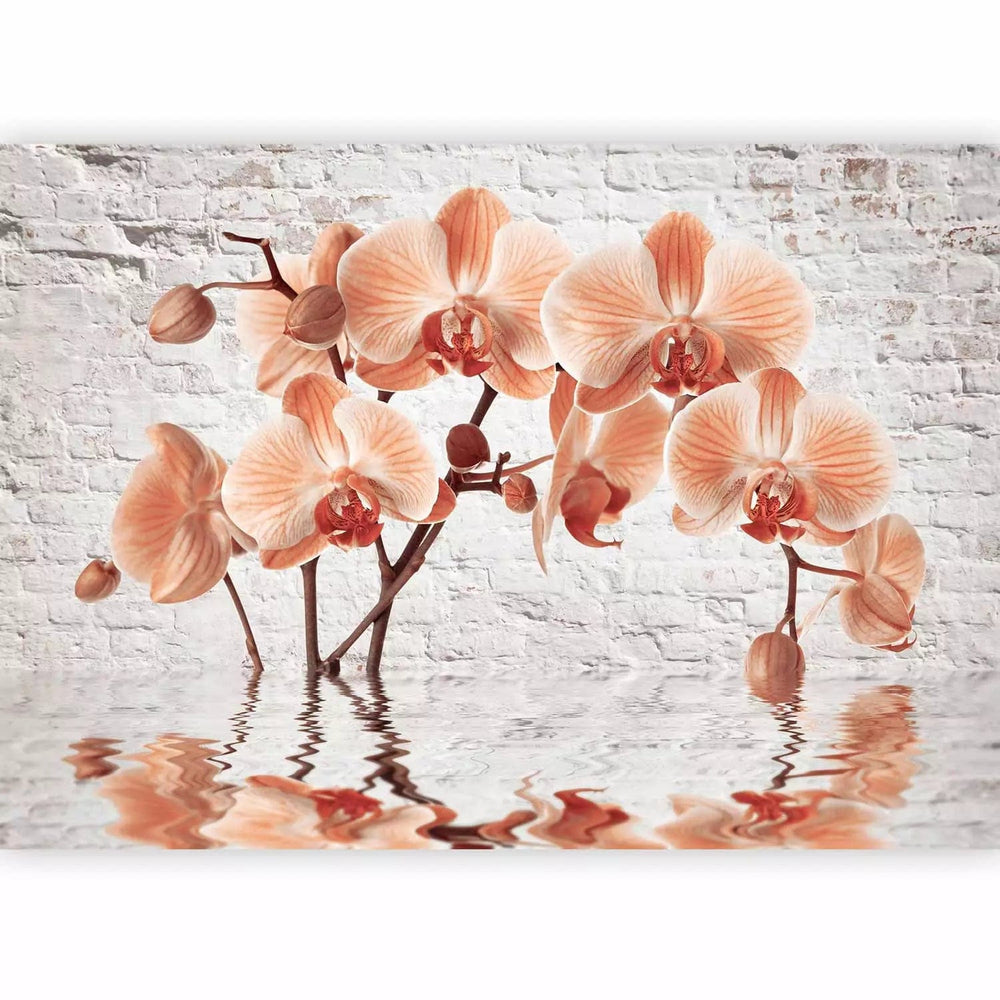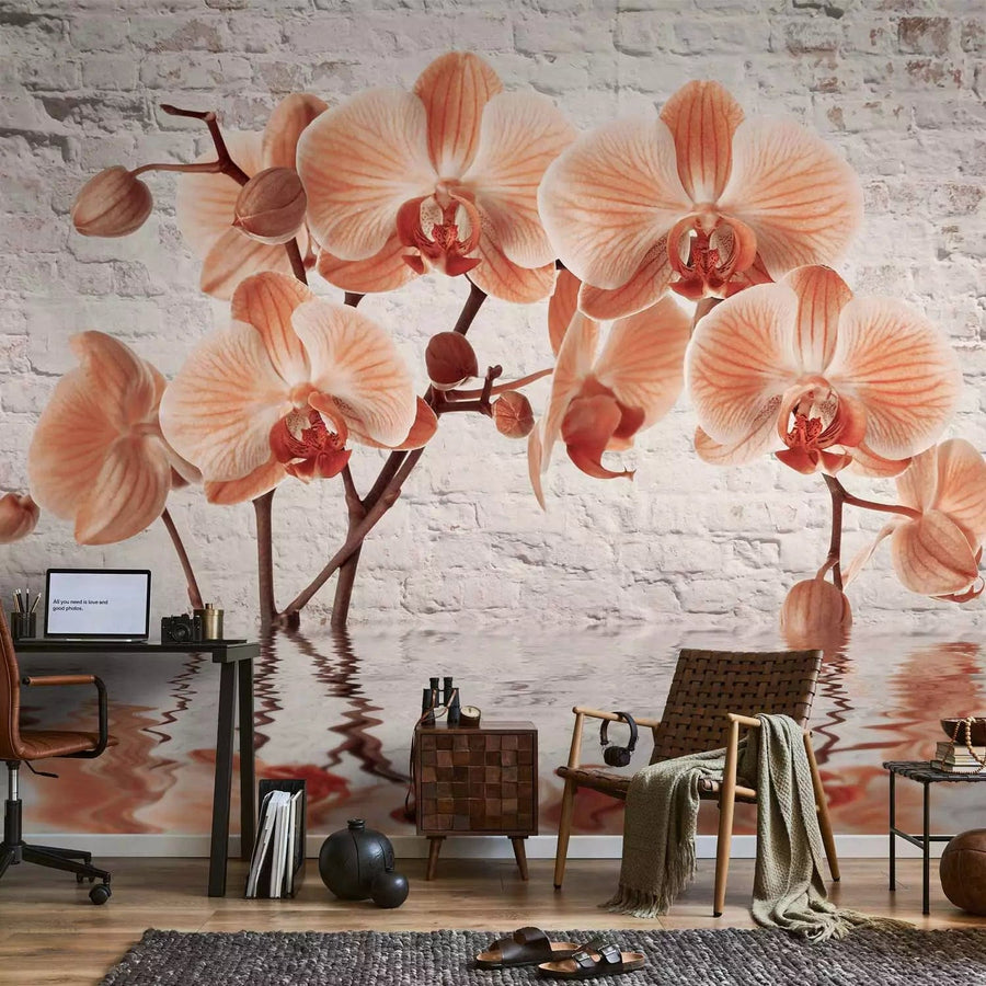 Fototapetes - Oranžā orhideja uz pelēka ķieģeļu sienas fona, 62018 G-ART