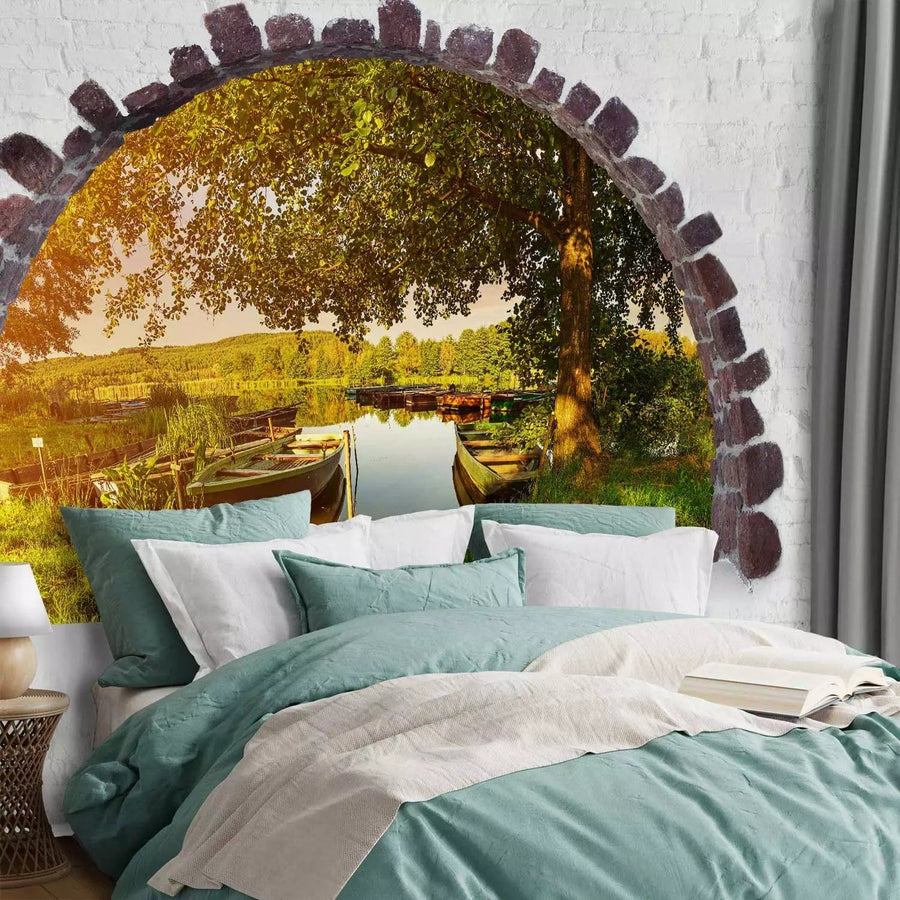 Fototapetes - ainava ar ezeru un laivām, ko ieskauj zaļi koki, 94403  G-ART