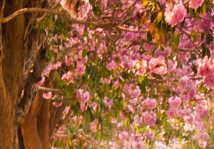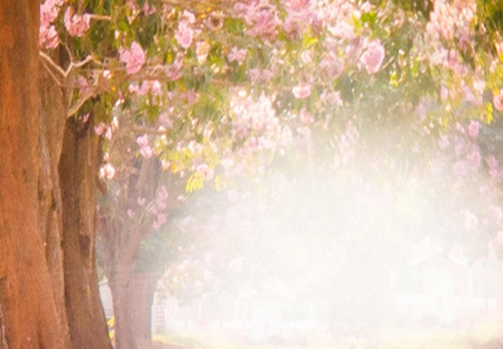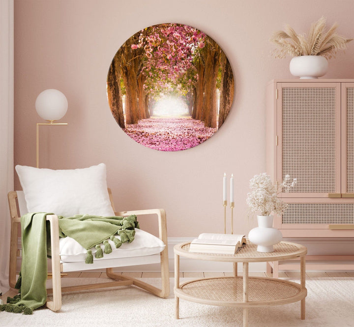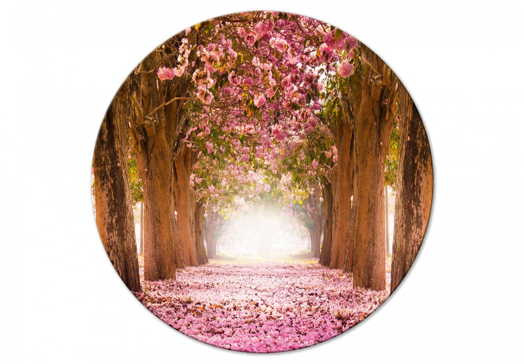 Pyöreä сanvas-taulut (Deluxe) - Puut vaaleanpunaisilla lehdillä auringonvalossa, 148631