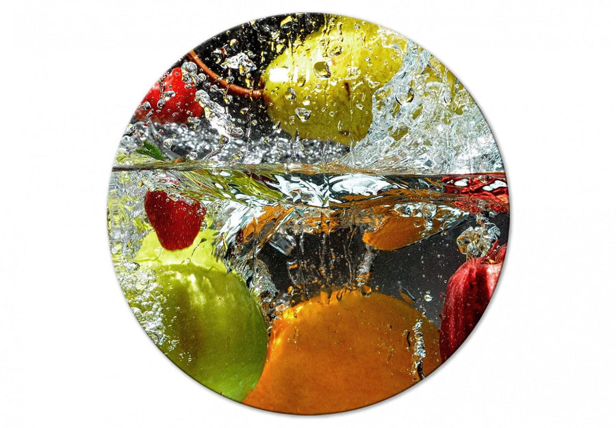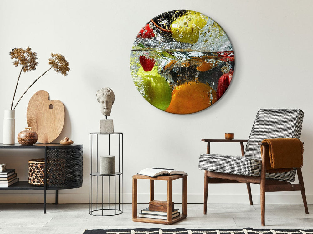 Apaļa glezna - Fotogrāfija ar augļiem, kas krīt ūdenī uz melna fona G-ART