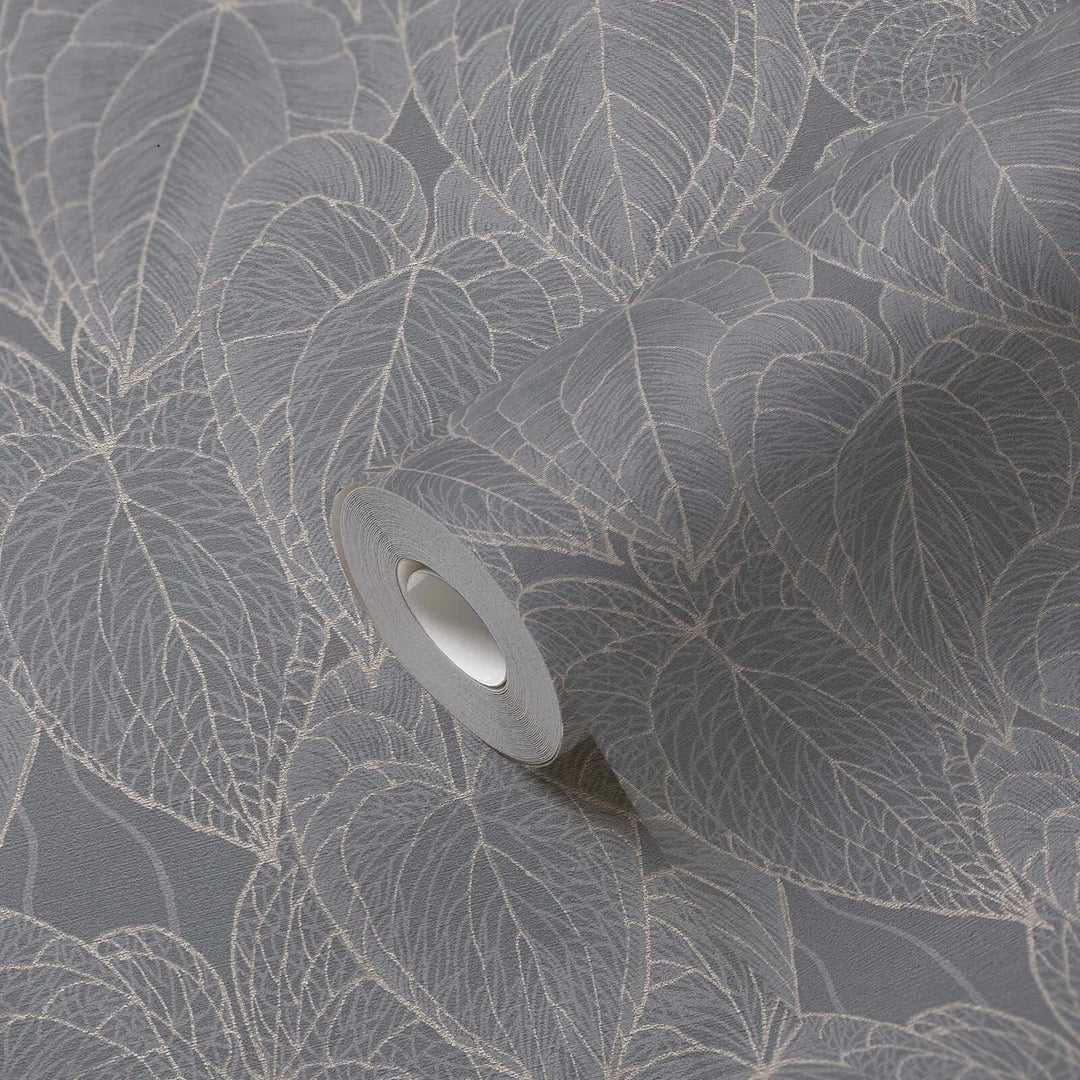 Daniel Hechterin harmaat ja kultaiset lehtikuvioiset tapetit antavat seinille hohtavan ja modernin ilmeen.