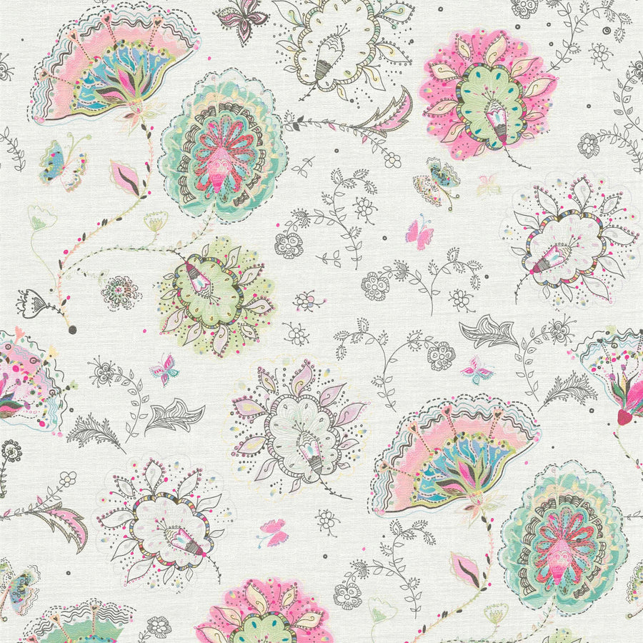 Tapetit kukkakuvio kirkkaissa väreissä - kerma, vihreä, vaaleanpunainen, 1367577