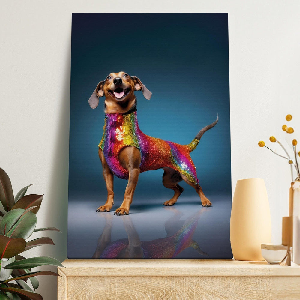 Canvas-taulut - Mäyräkoira - hymyilevä koira värikkäässä puvussa, 150248 🎨🐶