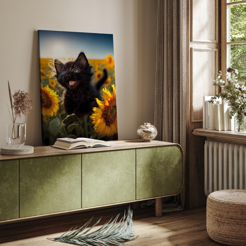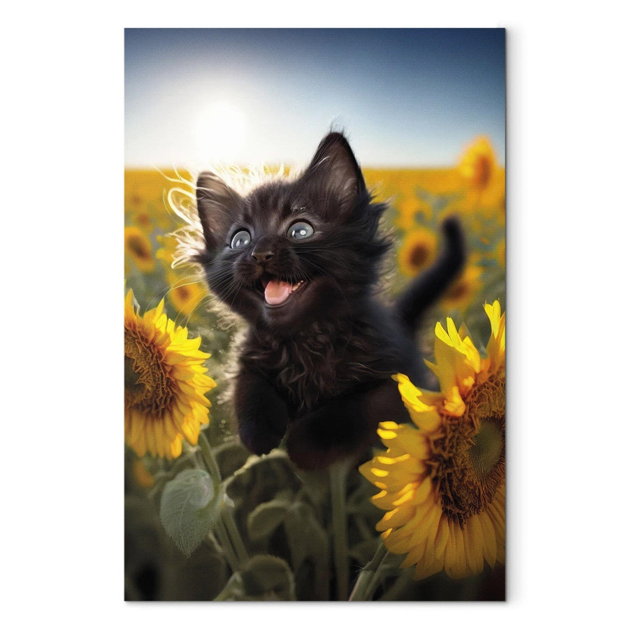 Canvas-taulut - Musta kissa tanssii auringonkukkapellolla auringonvalossa, 150122