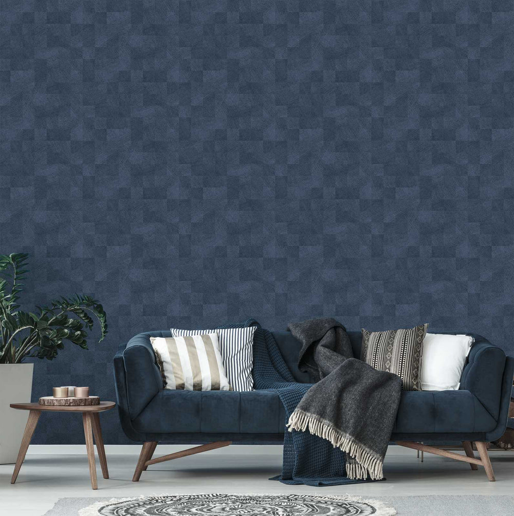 Tapetes nakts zilā krāsā ar metālisku spīdumu un rūtiņu rakstu 382005 Tapetenshop.lv