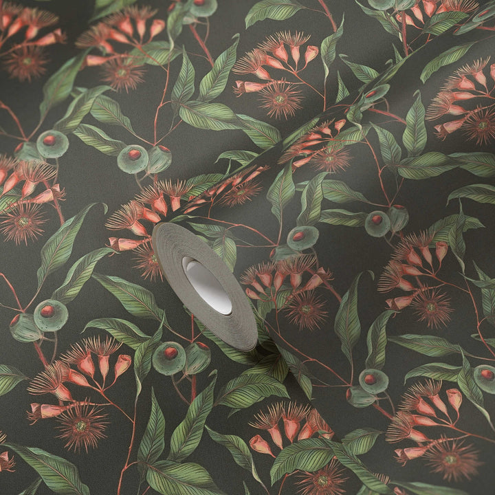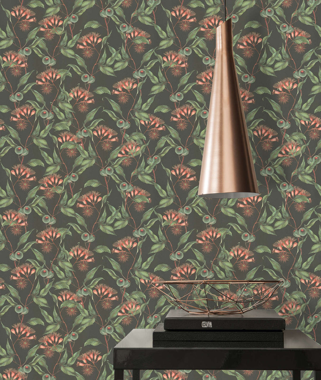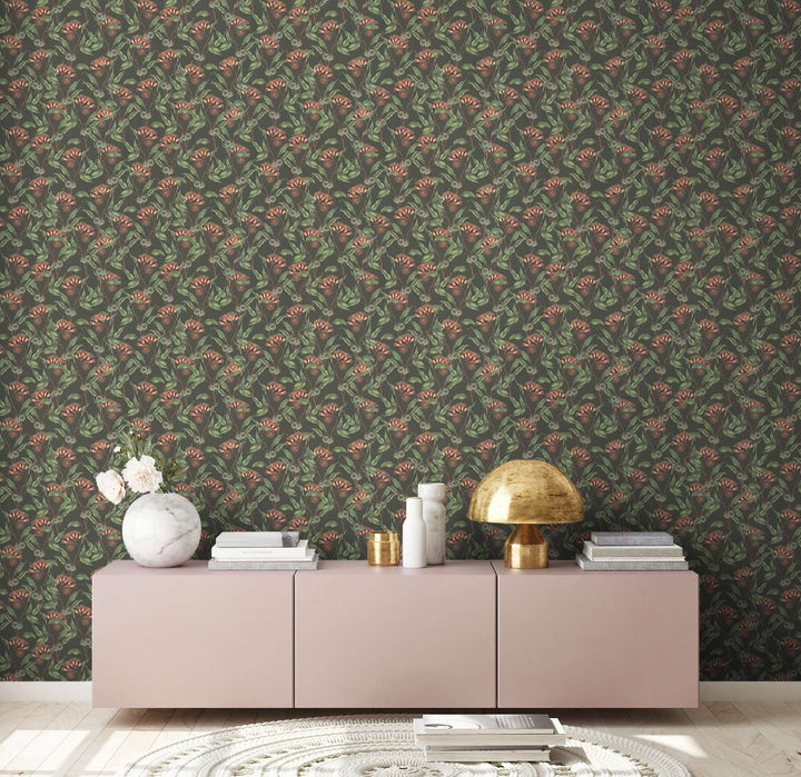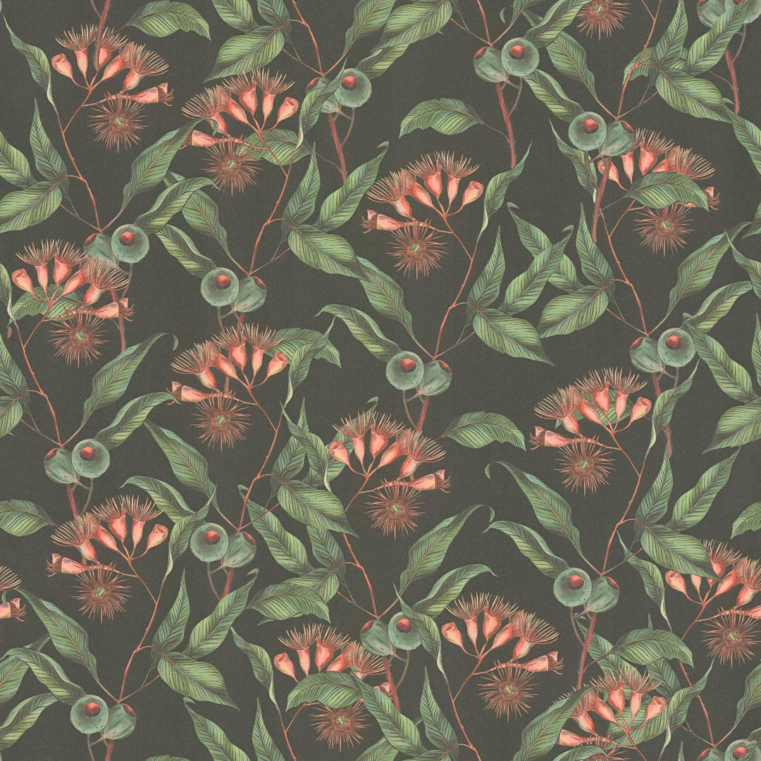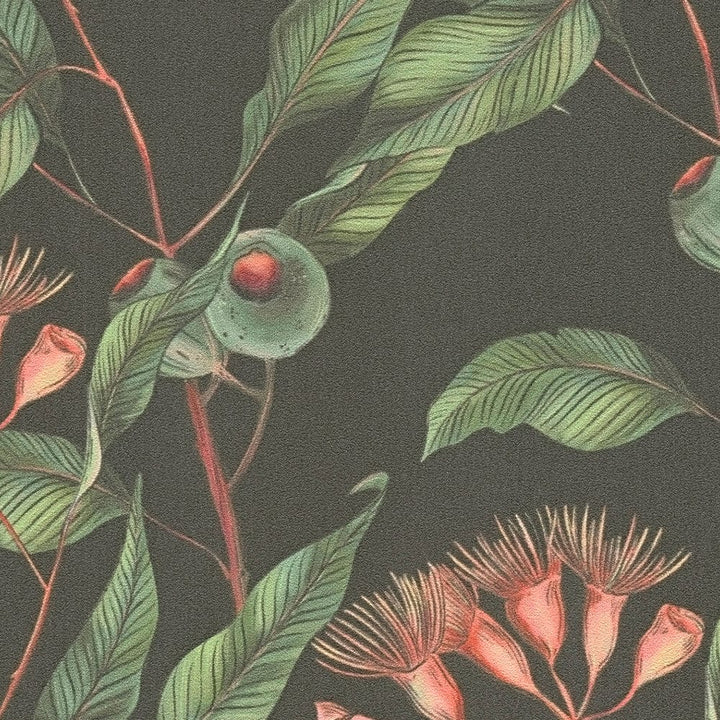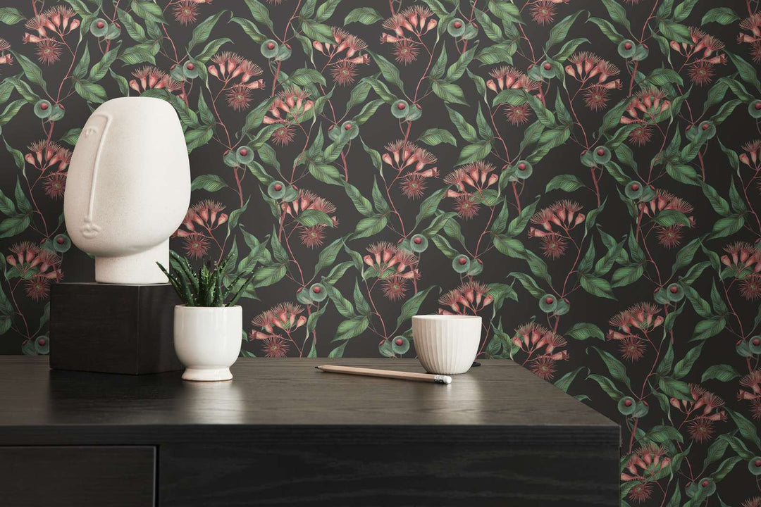 Tapetit trooppisia kukkia ja lehtiä: vihreä ja musta, 1402075