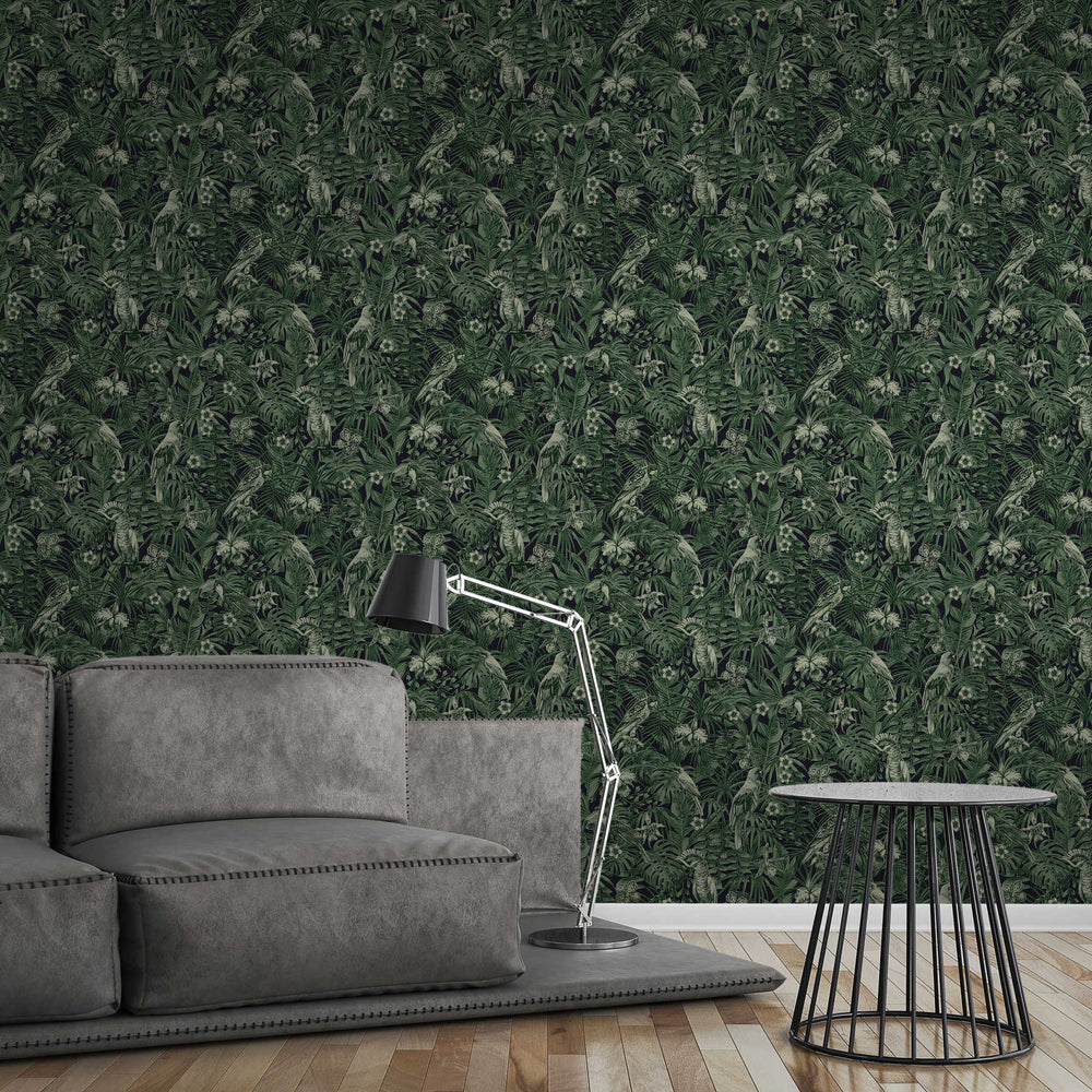 Trooppinen tapetti viidakkoaiheella ja metallinhohtoisella kiillolla - vihreä - 1343365