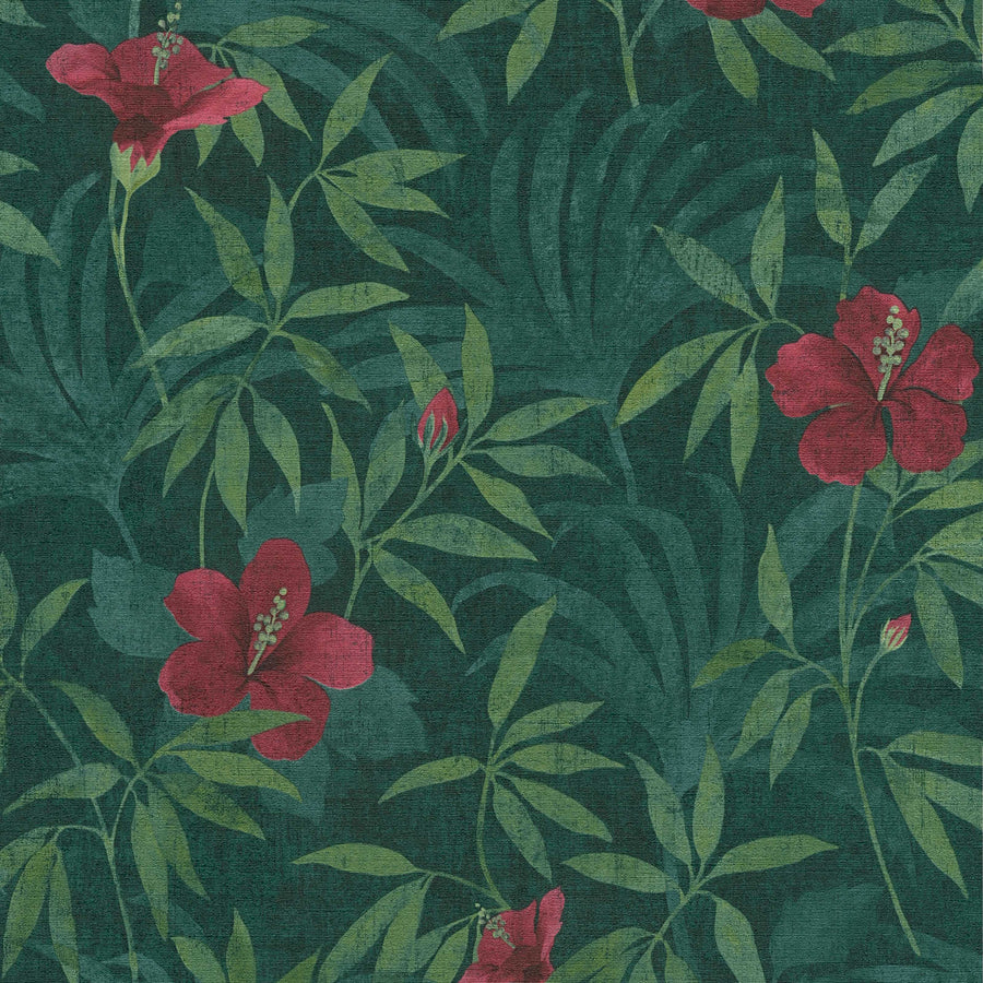 Tapetes ar palmu lapām un eksotiskiem ziediem, zaļā, 394353 AS Creation